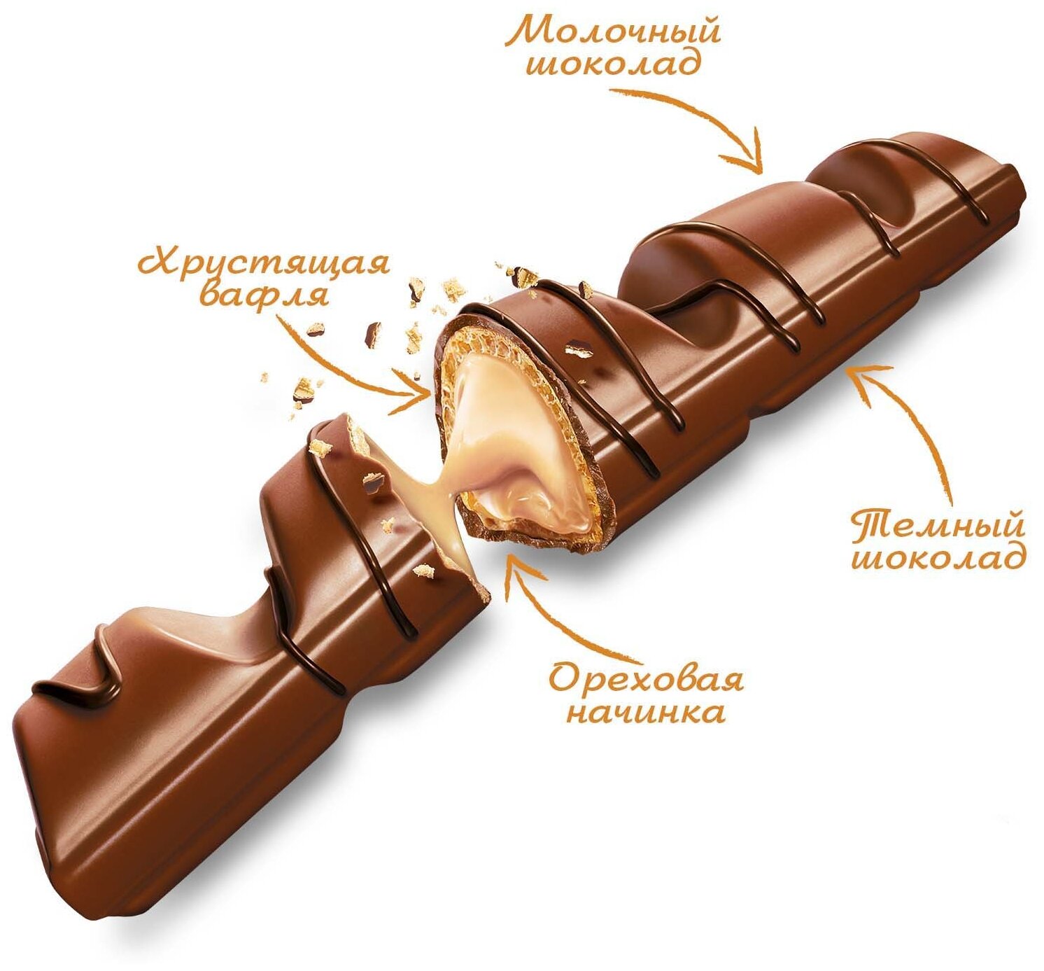 Хрустящая вафля, покрытая молочным шоколадом с нежной молочно-ореховой начинкой. Два индивидуально упакованных батончика обладают высокими вкусовыми качествами благодаря молочному шоколаду Kinder® и оригинальной начинке.