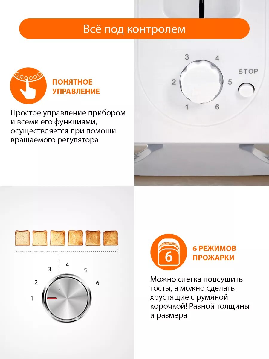 Тостер в корпусе из пищевой нержавеющей стали и термостойкого пластика, 6 режимами работы и плавной регулировкой мощности.6 режимов обжаривания позволят получить хрустящие равномерно обжаренные тосты из любых сортов хлеба - от светлого пшеничного до темного ржаного. Тостер оснащен двумя отсеками для одновременного обжаривания двух кусочков хлеба, а съемный поддон для крошек существенно упрощает его очистку. Функция автоматического отключения тостера при перегреве исключает риск его повреждения, а материал корпуса опасность обжечься. Тостер удачно впишется в дизайн любой кухни и наполнит ее великолепным ароматом обжаренного хлеба.