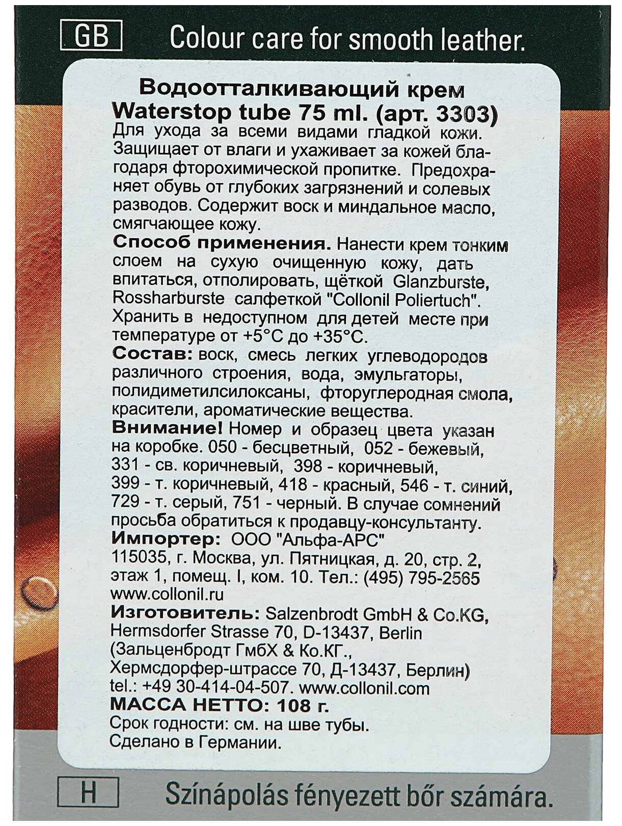 Крем Collonil Waterstop Colours водоотталкивающий для ухода за всеми видами гладкой кожи. Защищает от влаги и ухаживает за материалом благодаря фтороуглеродным соединениям. Предохраняет изделие от глубоких загрязнений и солевых разводов. Содержит воск и миндальное масло, интенсивно смягчающее и ухаживающие за кожей. Подходит для Hi-Tech материалов.