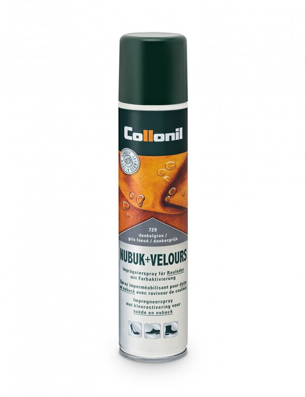 Спрей Collonil Nubuk+Velours на основе фтора для ухода и защиты изделий (одежды, обуви, сумок, аксессуаров и пр.) из замши, велюра, нубука, текстиля и мембран. Обеспечивает длительную защиту от влаги, грязи и жира. Воздухопроницаемость и качество материала на ощупь сохраняются. Обновляет цвет. Подходит для Hi-Tech материалов.