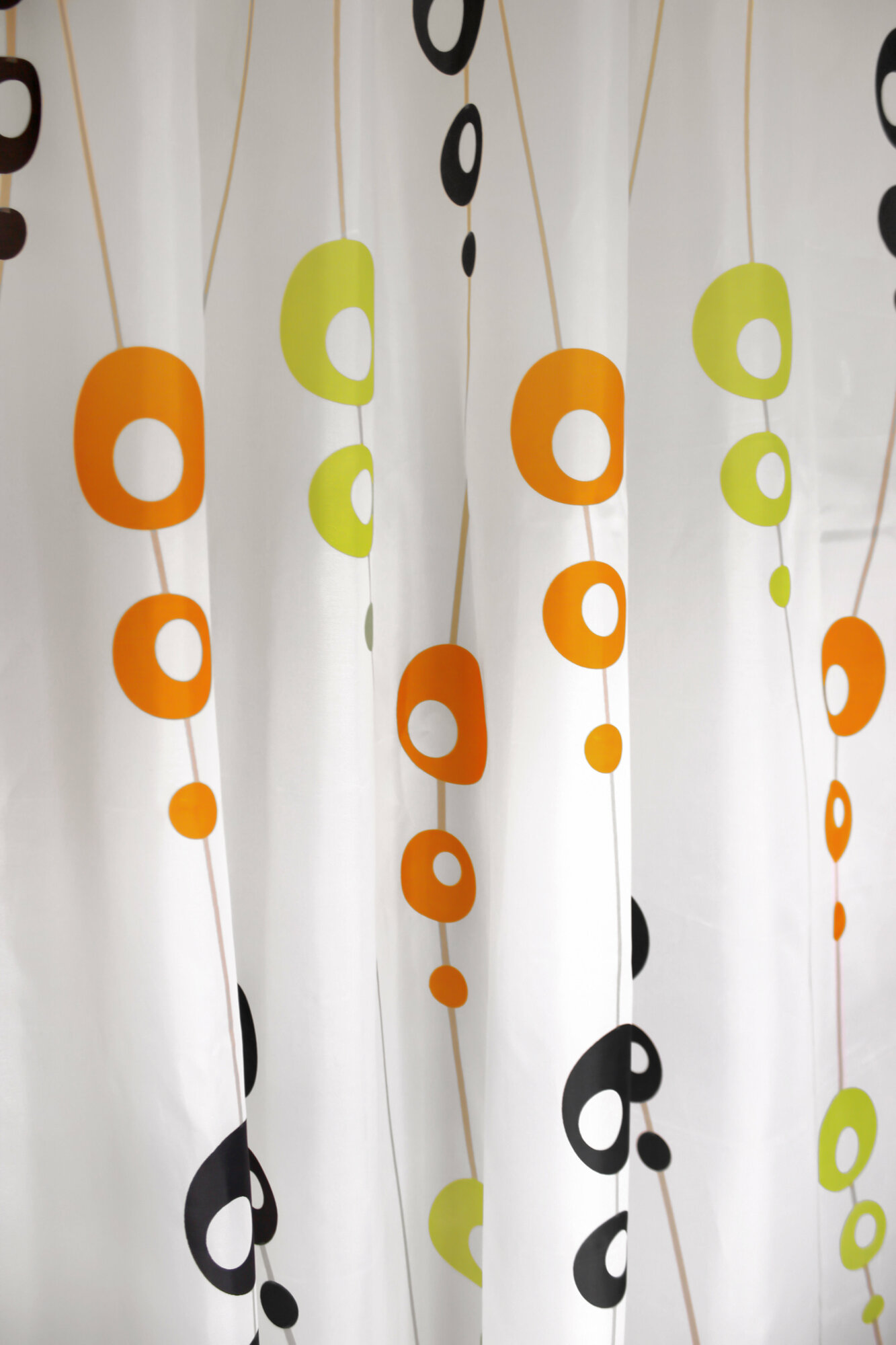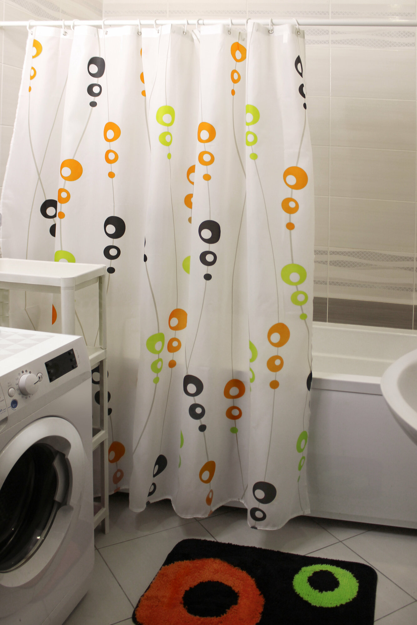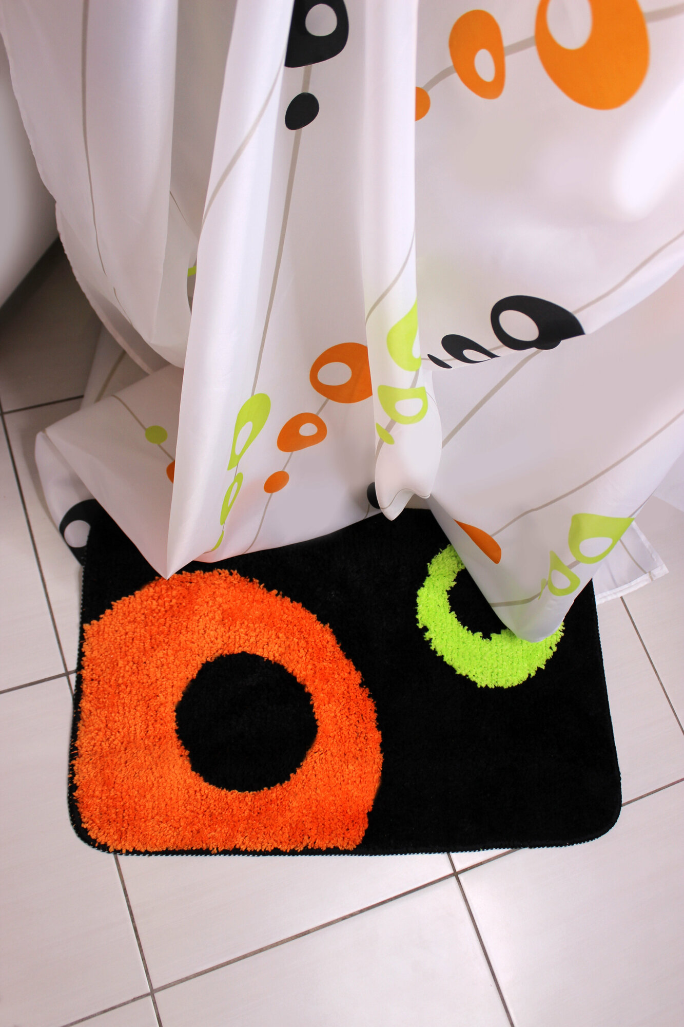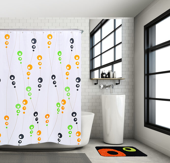 Набор для ванной комнаты MySpace Molecule включает в себя занавеску из полиэстера и пушистый коврик. В комплекте также присутствуют 12 колец для подвешивания занавески. На занавеску и коврик нанесены принты в виде окружностей разного диаметра.