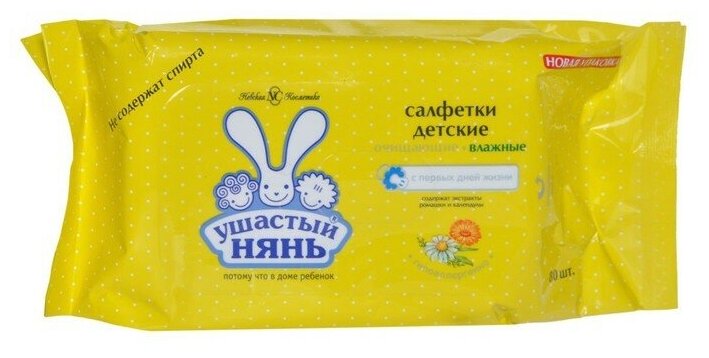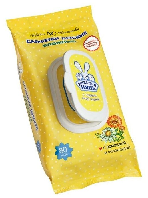 Салфетки влажные для детей Ушастый нянь "С ромашкой и календулой" бережно очищают, увлажняют и освежают кожу, сохраняют естественный защитный барьер кожи, т.к. имеют рН близкий к коже ребенка и подходят для всего тела, включая лицо. Салфетки изготовлены на основе натурального волокна повышенной плотности, что обеспечивает повышенные характеристики мягкости, впитываемости и гигиеничности, они не рвутся и не вытягиваются и имеют оптимальный размер.