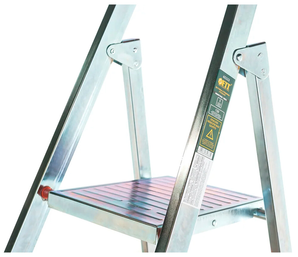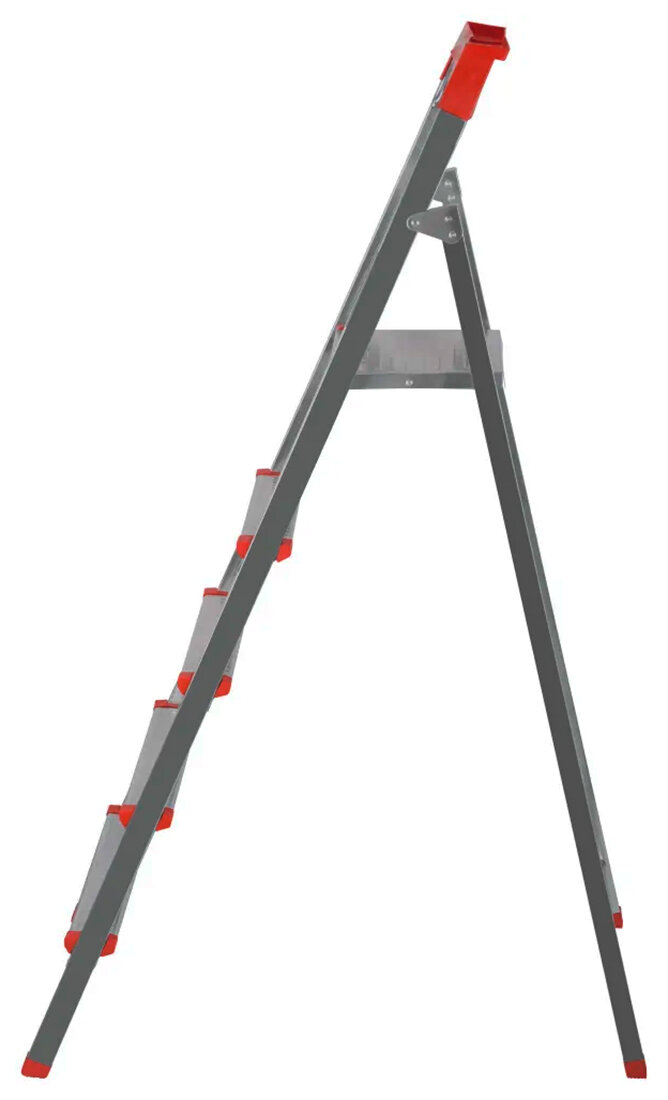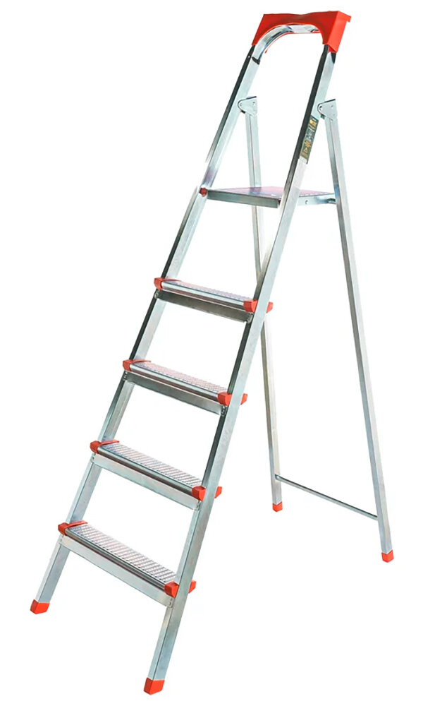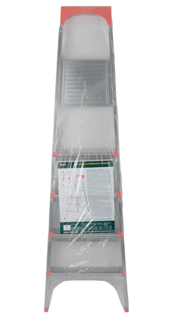 Прочная стальная рама из профиля прямоугольного сечения большой толщины, а также профилированные противоскользящие ступени являются надежной основой для эксплуатации лестницы-стремянки. Массивная верхняя площадка с рифленой поверхностью, надежно закрепленное, широкое устойчивое основание, высокая дуга безопасности, предусмотренные конструкцией пятиступенчатой стремянки, защищают от падений.