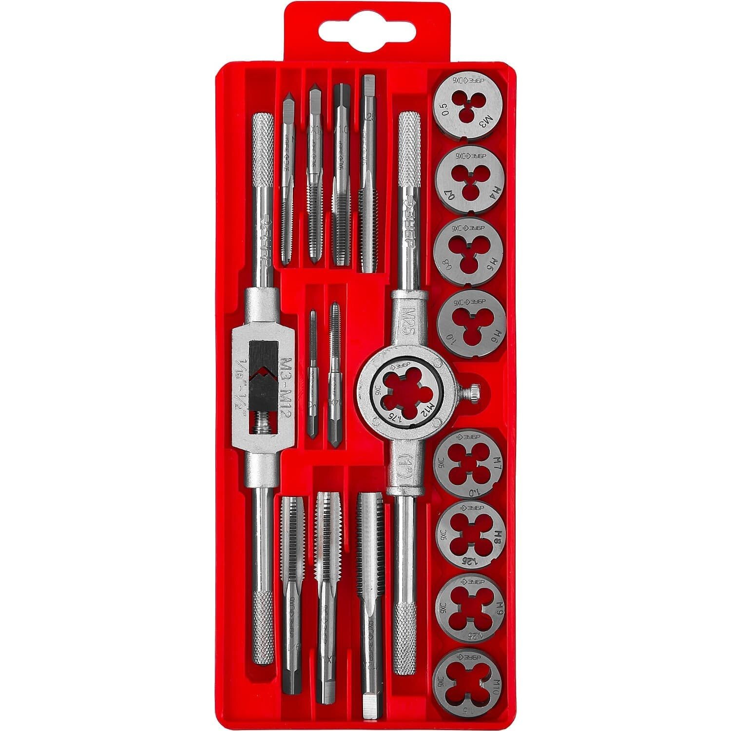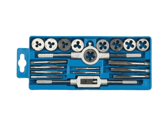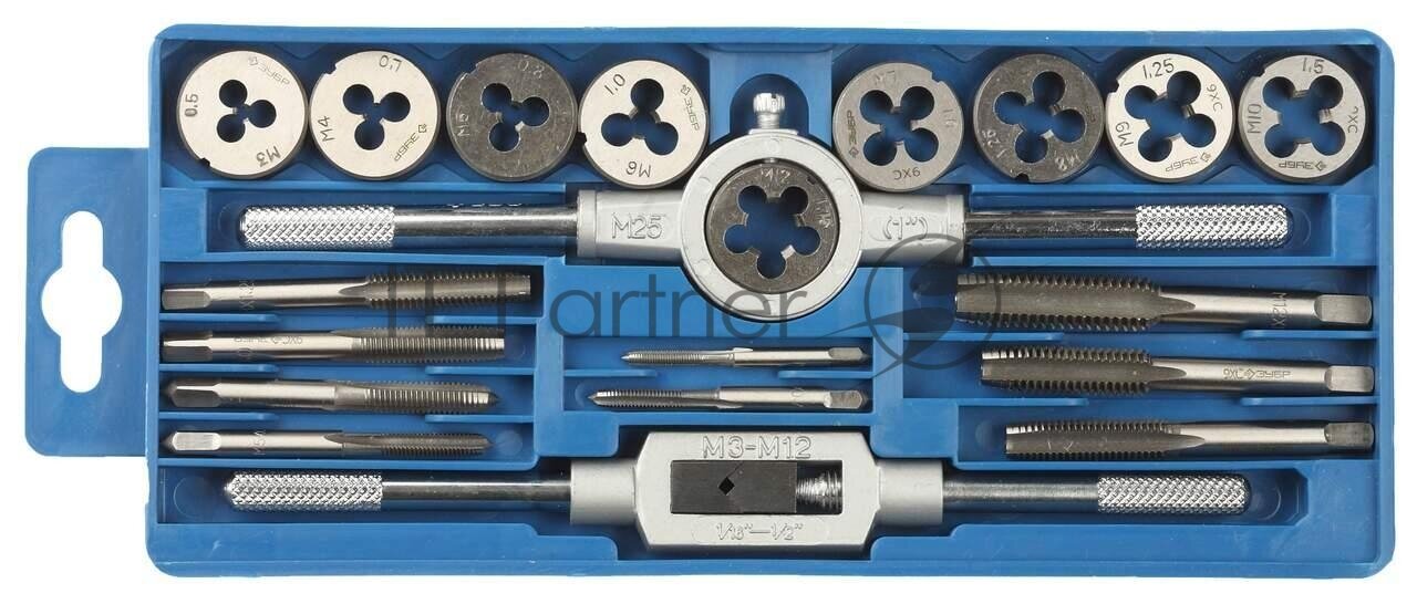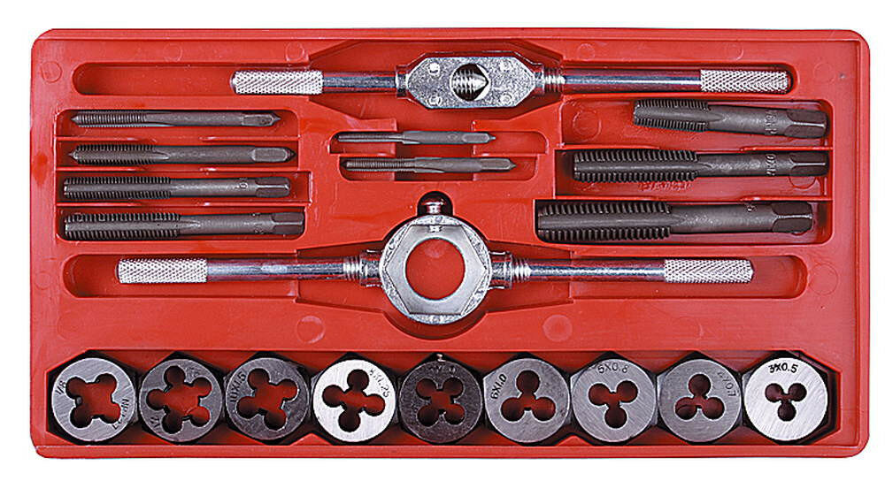 | Комплектация | Метчики3х0.5, 4х0.7, 5х0.8, 6х1.0, 7х1.0, 8х1.25, 9х1.25, 10х1.5, 12х1.75;Плашки3х0.5, 4х0.7, 5х0.8, 6х1.0, 7х1.0, 8х1.25, 9х1.25, 10х1.5, 12х1.75;Метчикодержатель;Плашкодержптель;Пластиковый бокс. |