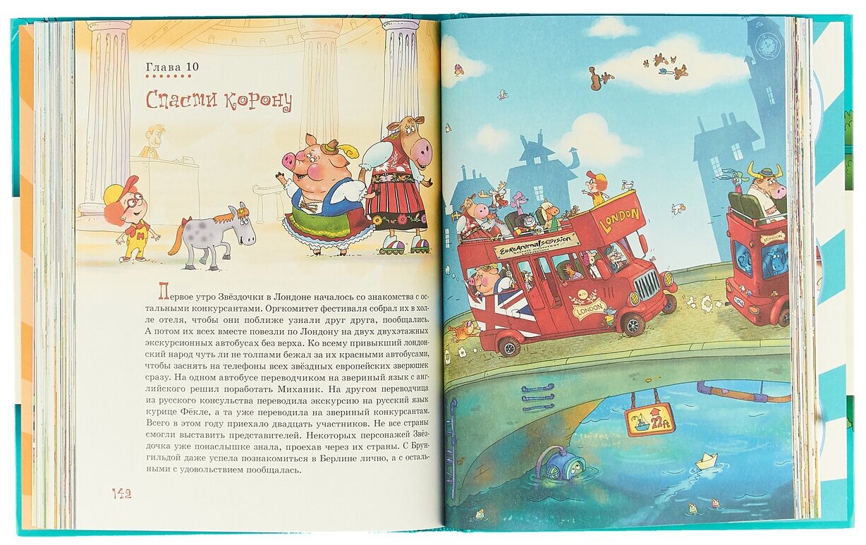 9) «Звёздочка на Еврозверовидении» полна лайфхаков! Из неё вы узнаете: как написать и записать хитовую песню, как найти спонсора и дирижабль, как без денег добраться из Польши в Лондон, кто живёт в Берлинском Зоопарке, что лучше всего петь у Лувра и Эйфелевой башни, как попасть в английскую футбольную команду и пообщаться с королевой, у кого лучший нос в Лондоне, ну, и, конечно же, чем полезны большие зелёные мухи. В приложении к книге есть настольная игра!