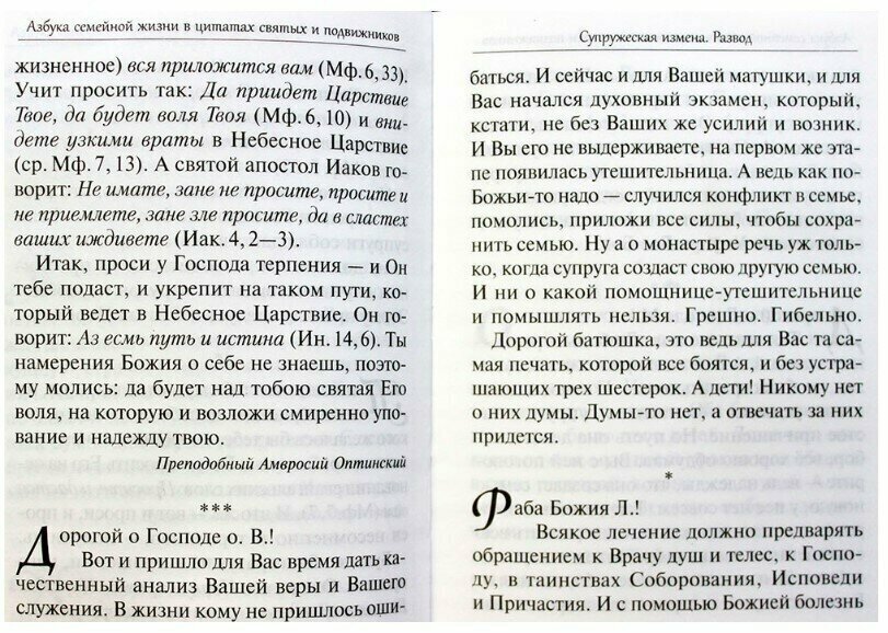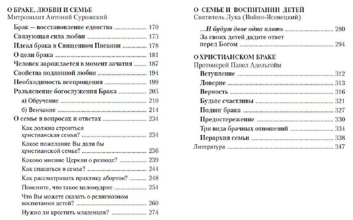 В этом издании читатель найдет ответы на большинство вопросов, возникающих в семейной жизни или при подготовке к ней. Обширная подборка цитат из переписки прославленных старцев с духовными чадами расположена по временной тематике: от выбора супруга до воспитания детей и вдовства. Освещены проблемы развода и супружеской неверности, подвергаются критике современные представления о браке как о партнерстве. Замечательные проповеди святителя Луки Крымского, митрополита Антония Сурожского и протоиерея Павла Адельгейма помогут глубже понять смысл подлинного христианского единения супругов в браке.