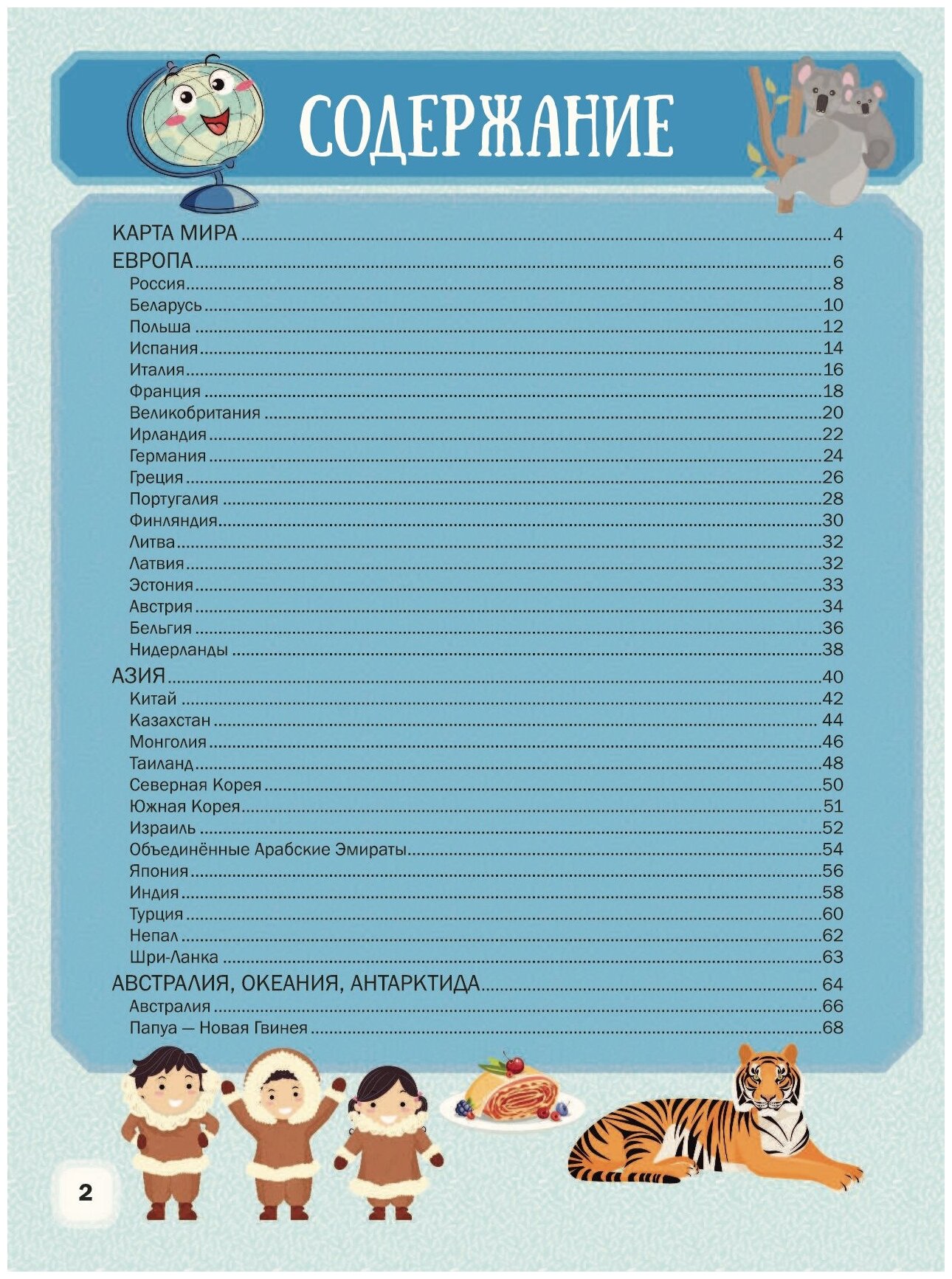 Покупала для дочки 3,5 года. Нам обеим понравилась. Атлас толстый (127 стр), но не перегруженный. На каждую страну по одному развороту, на котором помещается краткая справка, флаг страны и несколько интересных фактов. Страницы очень плотные. Рисунки понятные, узнаваемые. Опечаток и явных ошибок при беглом просмотре не заметили. Твердая 5+