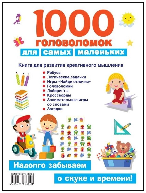 "1000 головоломок для самых маленьких" - сборник головоломок, ребусов, лабиринтов, кроссвордов, загадок. Предложите ребёнку угадывать зашифрованные слова, проходить лабиринты, решать логические задачки - такие интеллектуальные занятия развивают мышление, расширяют кругозор и словарный запас, тренируют память, внимание, наблюдательность, смекалку и творческие способности. Ребёнок откроет первую страницу - и уже не сможет оторваться!