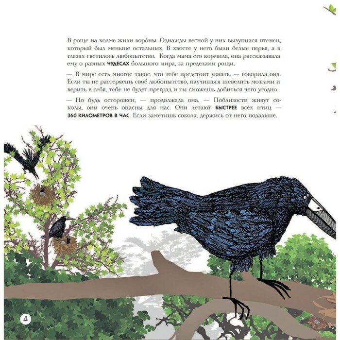 Как мама мальчика я часто покупала и покупаю книги, на которых есть машинки))) Текст хороший, крупный, есть буква ё, хороший интервал, но иногда он на темном фоне. В любом случае для моего начинающего читателя много текста, читала всю книгу ему сама. Конечно трудно в таком потоке книг удивить ребенка очередной покупкой, но на удивление сын попросил почитать и сразу. Что сказать про содержание...Итак, рос себе ворон, не такой как все, в хвосте у него были белые перья, захотелось ему быть быстрее , даже быстрее сокола. И вот вылетел он из гнезда с товарищами и поселился как я поняла, на свалке, и стали они по инструкции собирать супер быстрый автомобиль, чтобы сбылась мечта ворона и собрали таки))) мечта сбылась. Вы не думайте, что просто они собирали, они собирали его по инструкции, которая там почти вся дана))) даже муж был в шоке от таких подробностей))) в книге нарисован подробный план двигателя))) было интересно поразглядывать, хоть ничего и не понятно)))) Что НЕ понравилось - опять не люди, вороны....сын всю книгу ахал какие однако умные вороны попались)))) хочется людей!!! Иллюстрации тоже не мои, какие-то тусклые... Текст для меня скучноват, но сын ни разу не остановил, слушал с интересом. Что ПОНРАВИЛОСЬ. Однозначно понравилась общая мысль и посыл книги, на протяжении повествования повторяется одна фраза "Если ты не растеряешь свое любопытство, научишься шевелить мозгами и верить в себя, тебе не будет преград и ты сможешь добиться чего угодно", вот только из-за этой фразы я готова ее читать и читать, вообще очень позитивный посыл, ведь ворон не сдается, не на миг не сомневается в себе и ведет воронов к цели, к своей цели, это дорогого стоит! Книга конечно совсем не обязательная, но любители машинок оценят.