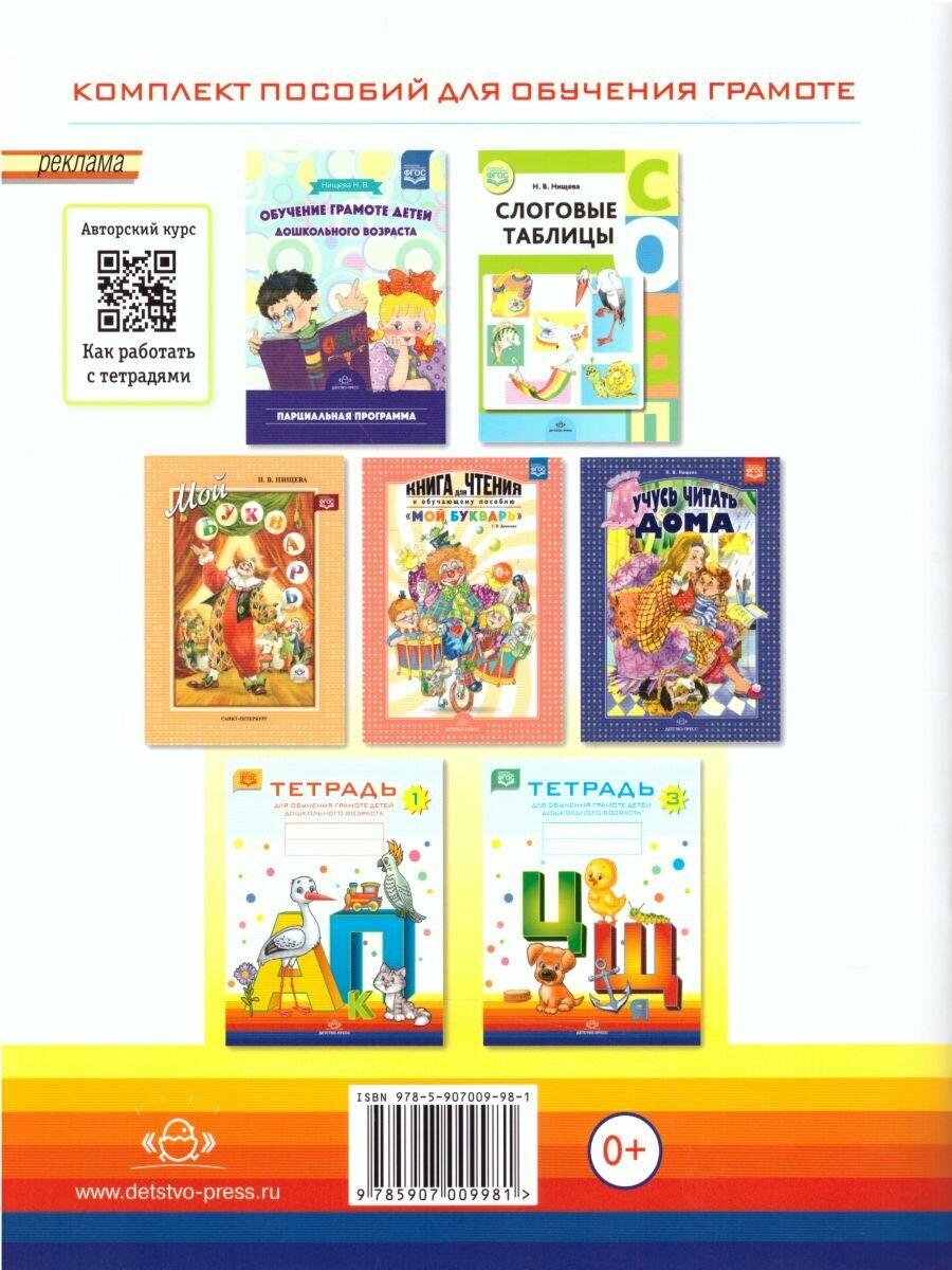 Тетрадь входит в методический комплект парциальной программы "Обучение грамоте детей дошкольного возраста" вместе с книгой "Мой букварь". Задания тетради точно соответствуют второй части "Моего букваря", знакомят ребенка с буквами Бб, Дд, Гг, Фф, Вв, Хх, ы, Сс, Зз, Шш, Жж, Ээ, дополняют материалы, предложенные в букваре для правильного обучения грамоте детей дошкольного возраста. Всего в комплект входят три тетради. Выполняя задания тетрадей под руководством взрослого, ребенок в игровой форме познакомится с буквами русского алфавита, научится читать и печатать слоги, слова, предложения, освоит начала звукового и слогового анализа и синтеза слов, что станет залогом успешного изучения русского языка в школе. В тетрадях содержится большое количество заданий для профилактики нарушений письменной речи (дисграфии, дислексии). Комплект тетрадей может использоваться для обучения грамоте детей дошкольного возраста уже с трех лет.