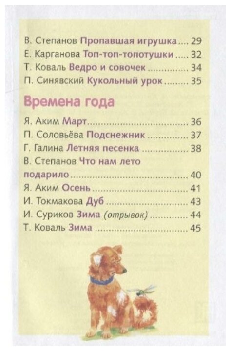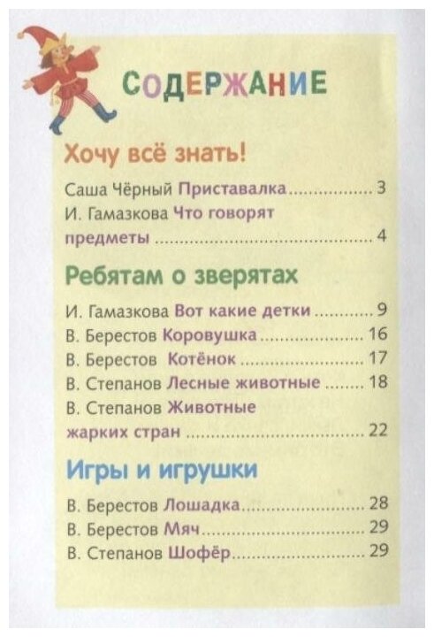 Как и все книжки "Стрекозы" из этой серии, имеет удобный формат, хорошее качество печати и переплёта. Стихи очень разные - и знаменитая "Приставалочка" Саши Чёрного, и малоизвестная очень приятная "Летняя песенка" Г.Галиной. Есть стихи для самых маленьких И.Гамазковой, сын (2г10м) после первого же прочтения декламировал "Барабан" и другие стихи о предметах (правда, водичка у нас сразу стала "буль-буль-буль"). К стихам И.Гамазковой о зверятах иллюстрации в стиле "очеловеченных животных", так не любимом мною (и многими родителями). Двуногие лошади меня просто повергли в ступор... К двустишию о собаке и щеночке нет иллюстрации, вряд ли был смысл вообще помещать его в книжку, при чтении он только дезориентирует малыша. В раннем возрасте ребёнок очень чётко воспринимает связь "стихи-картинка". К стихотворению Берестова "Котёнок" "воткнули" иллюстрацию от другого текста ("...Родились у нас котята..."). Рисунки к текстам В.Степанова более приятные, в меру реалистичные, но "открытия" автора в области зоологии потрясают... Всё-таки нужно знать, что рог у носорога - это не нос, а в сумке носят своих детёнышей только мамы-кенгуру.