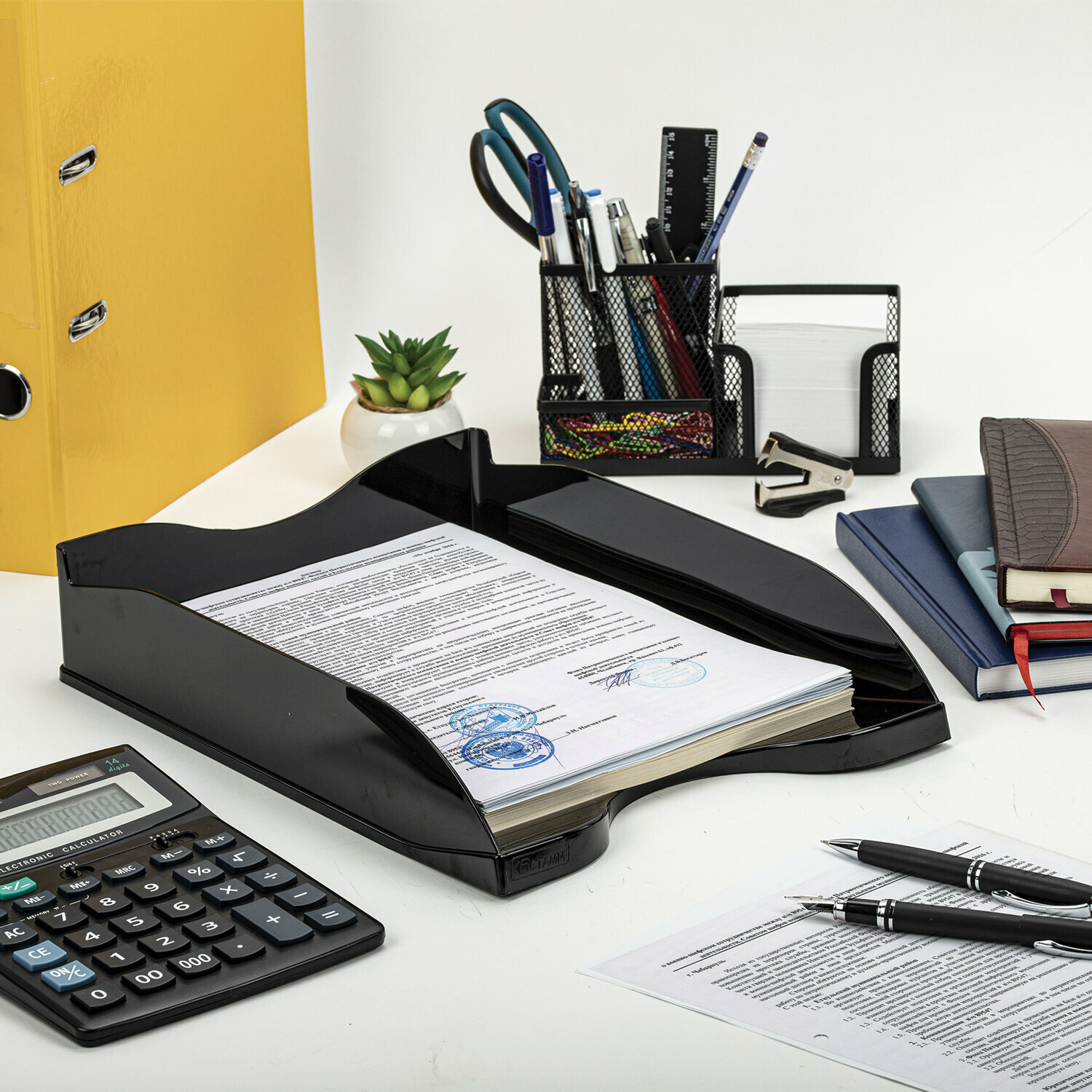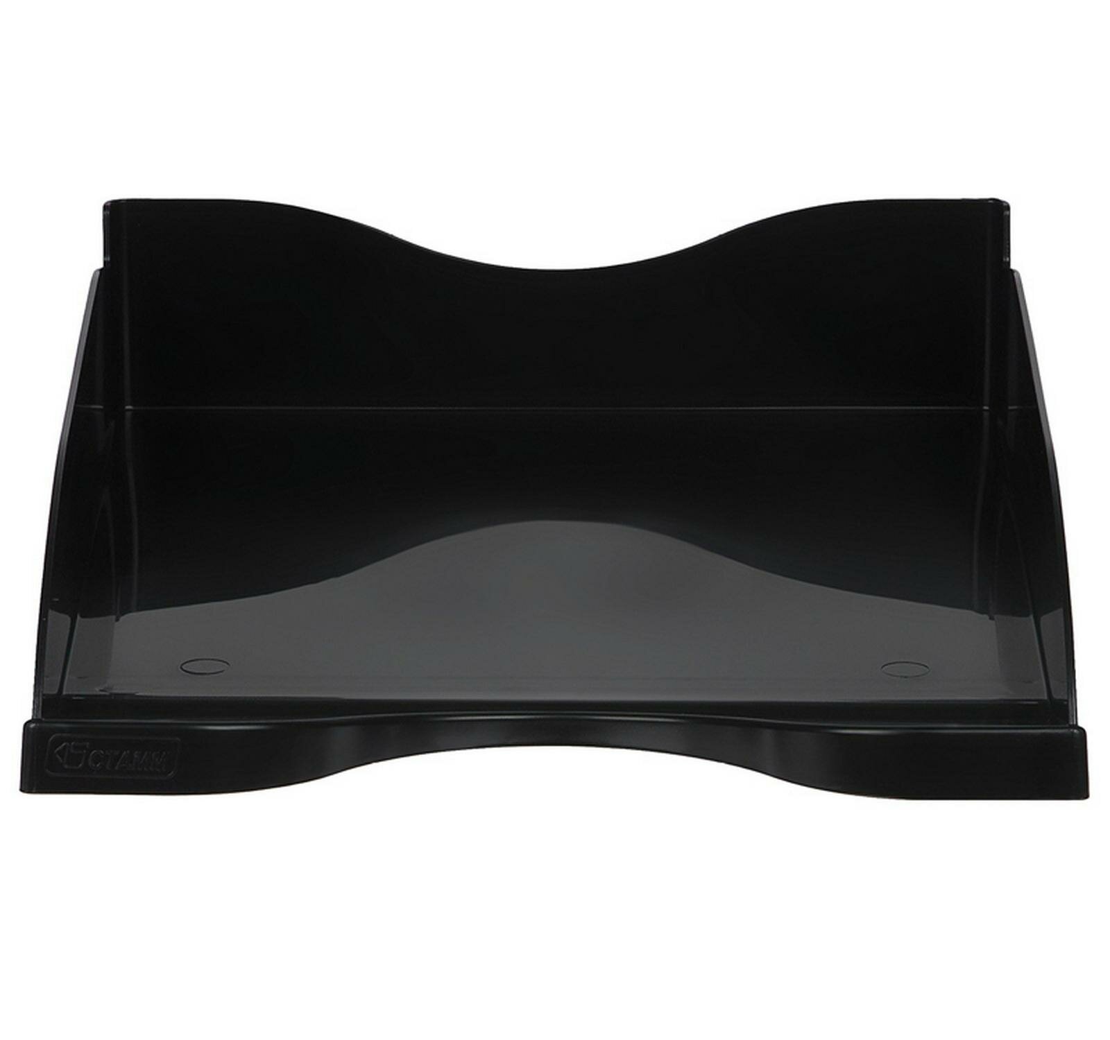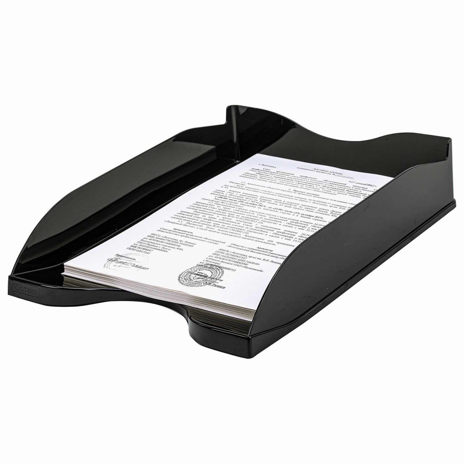 Лоток для бумаг горизонтальный Стамм "Люкс", черный, с пазами. Горизонтальный лоток представляет собой современную, надёжную и функциональную конструкцию для хранения и систематизации документов и бумаг формата А4. Имеет современный дизайн, вместителен, устойчив. Могут установливаться друг на друга. На корпусе имеются фиксаторы, препятствующие соскальзыванию с нижнего лотка. Изготовлен из полипропилена. Габариты 254/340/65 мм.