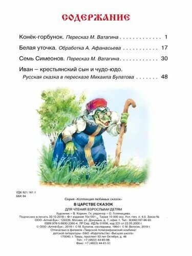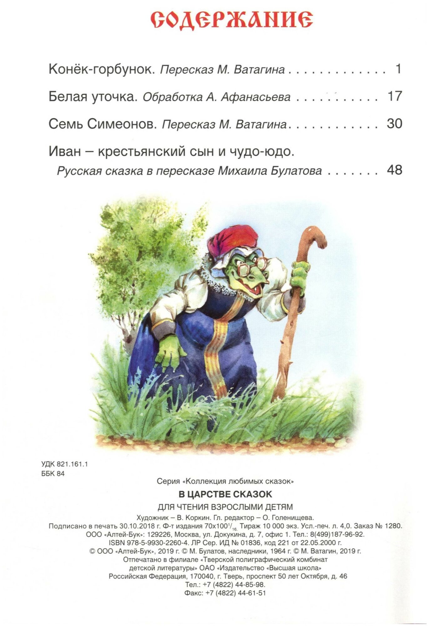 Серия "Коллекция любимых сказок".В царстве сказок.Авторы: П. П. Ершов, А. Н. Афанасьев и др.Страниц: 64. Обложка: твердая.Год издания: 2019.ISBN: 978-5-9930-2260-4.В сборник вошли сказки: "Конёк-горбунок" П. П. Ершова, "Белая уточка" из сборника А. Н. Афанасьева и русские народные сказки "Семь Симеонов", "Иван крестьянский сын и чудо-юдо".