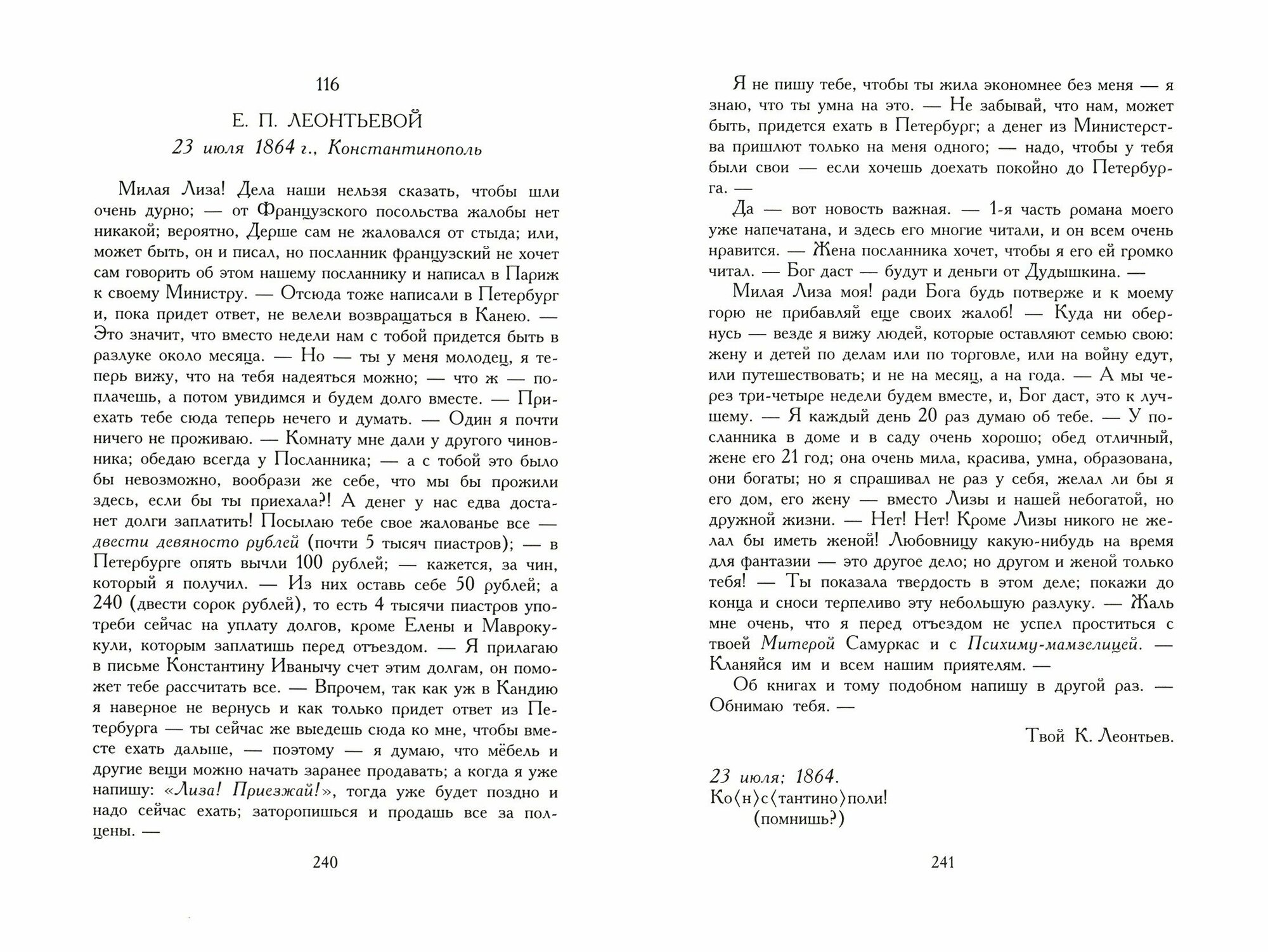 Этой книгой в собрании сочинений открывается серия писем. Несмотря на то, что эпистолярий Леонтьева сохранился с огромными лакунами (до сих пор не отысканы, к примеру, его письма к И. С. Тургеневу, Б. М. Маркевичу, кн. В. П. Мещерскому; сгорели письма к С. П. Хитрово), выявленный к настоящему времени корпус его писем значителен и по объему, и по ценности своего содержания. Открытость и "нелукавство" Леонтьева делают его письма лучшим восполнением задуманных им, но оставшихся незавершенными "посмертных записок". Самое раннее из сохранившихся писем относится к сентябрю 1853 года, последнее было написано за неделю до смерти. Перед нами, таким образом, предстает летопись почти сорокалетнего периода жизни писателя и мыслителя. Стилистически письма Леонтьева безупречны, смысловое наполнение от года к году становится все серьезнее и глубже. Присутствие бытовых моментов минимально, часто письма перекликаются с публицистикой Леонтьева или в чем-то дополняют ее.