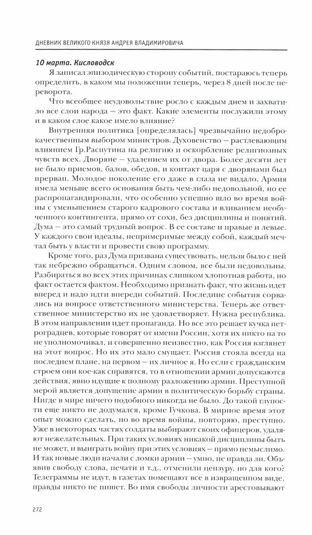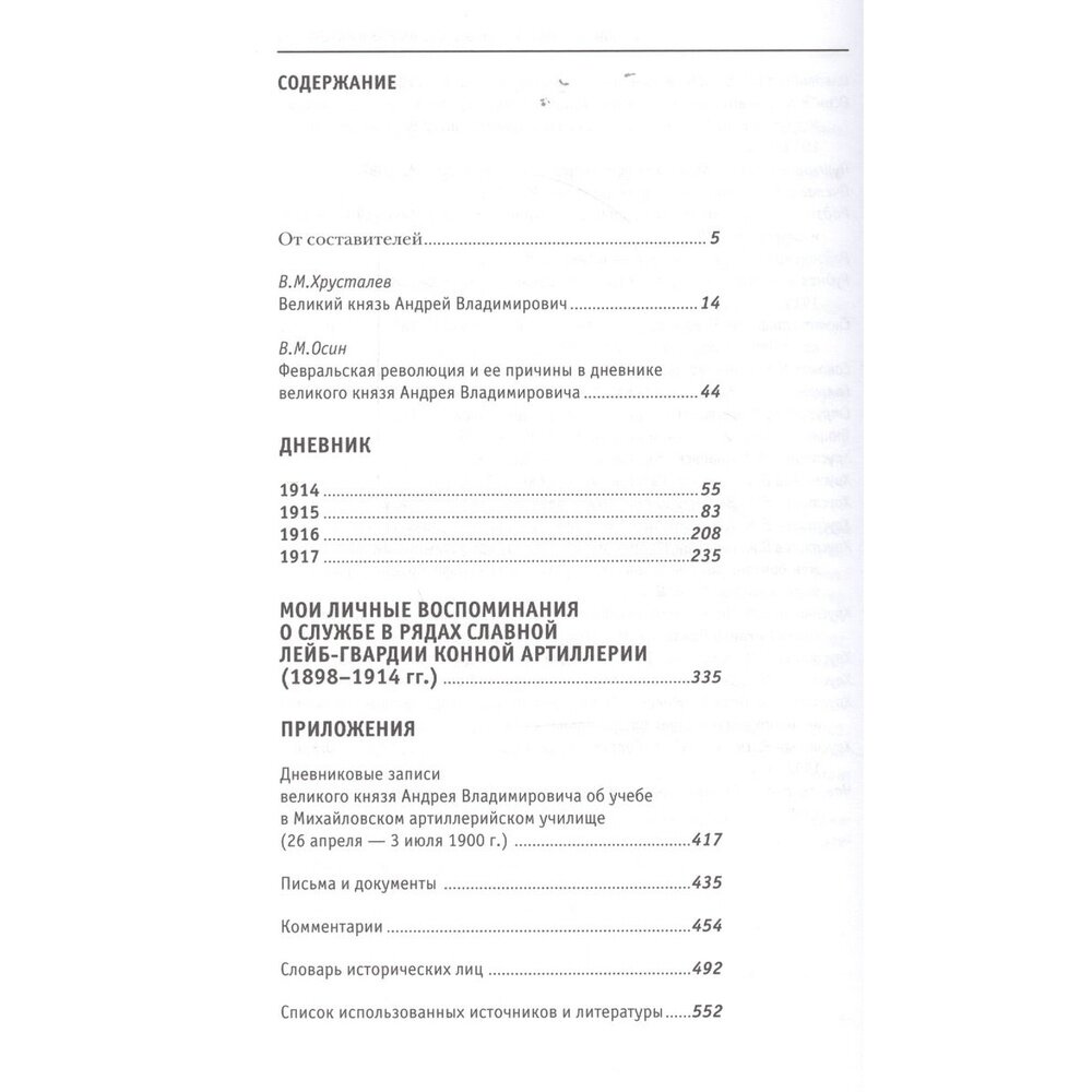 Это уже второе издание дневников двоюродного брата Императора Николая II от тех де составителей. Здесь оно дополнено воспоминаниями Великого Князя о службе в Конной артиллерии, которые были изданы Андреем Владимировичем в эмиграции в одном военно-историческом журнале. Издание предваряют подробные статьи с биографией Великого Князя и об отражении революции в его дневниках. Так же по сравнению с первым изданием, здесь представлены несколько писем Андрея Владимировича родственникам, публикуемые впервые. К сожалению, крайне скудно представлены записи за 1916 год, но это безусловно не является виной составителей сборника. Прекрасное издание для всех любителей российской истории, особенно периода поздней Империи и революции.