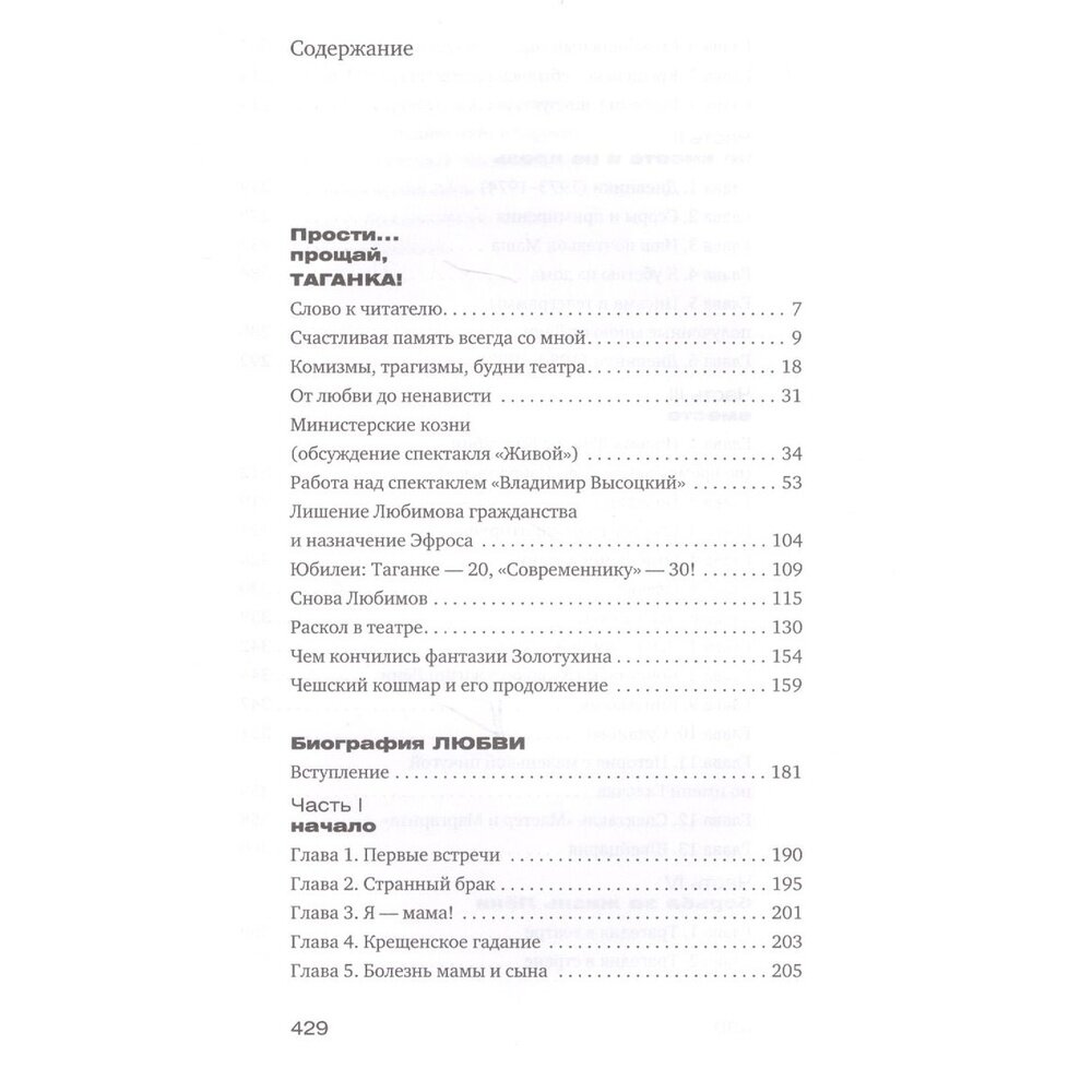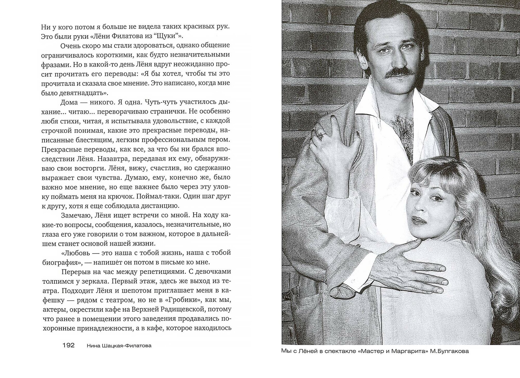 Две темы легли в основу воспоминаний актрисы Нины Шацкой-Филатовой - Театр и Любовь. Обе - с большой буквы, ибо Театром была легендарная Таганка, а Любовь стала и счастьем, и подвигом, и трагедией. В Театр на Таганке актриса пришла совсем молодой вместе с первым мужем, Валерием Золотухиным, и сыграла там много заметных ролей (венцом стала роль Маргариты в спектакле по роману Михаила Булгакова). Она пережила и расцвет Театра, и период непростых отношений с его главным режиссером Юрием Любимовым, и начало "рынка", доведшего уникальный творческий коллектив до распада…