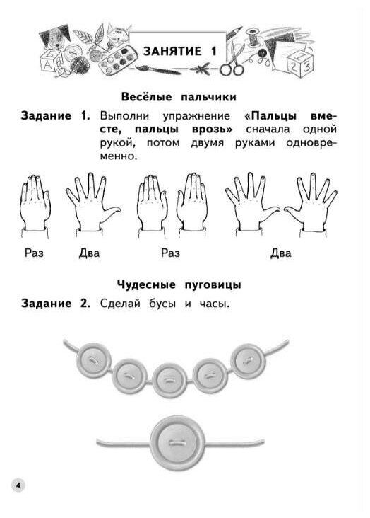 Очень хорошая книжечка для развития мелкой моторики. Есть задания по работе с пуговицами(сделать браслет, часы), вязание узлов, работа с бумагой и т.п. И хотя возраст указан от 5-ти лет, но некоторыми заданиями можно, мне кажется, заниматься и с 3-хлетнего возраста.
