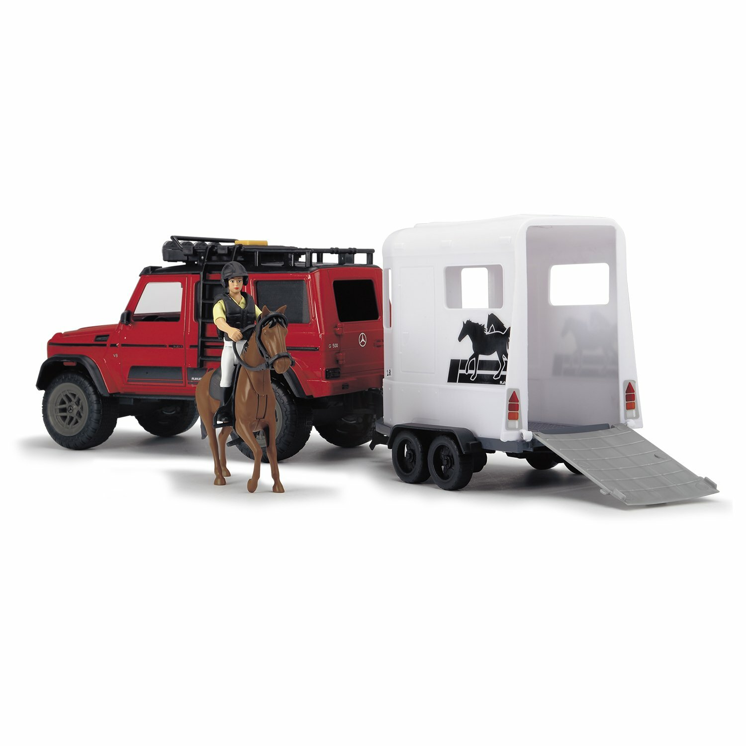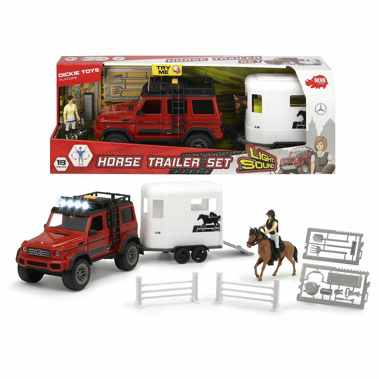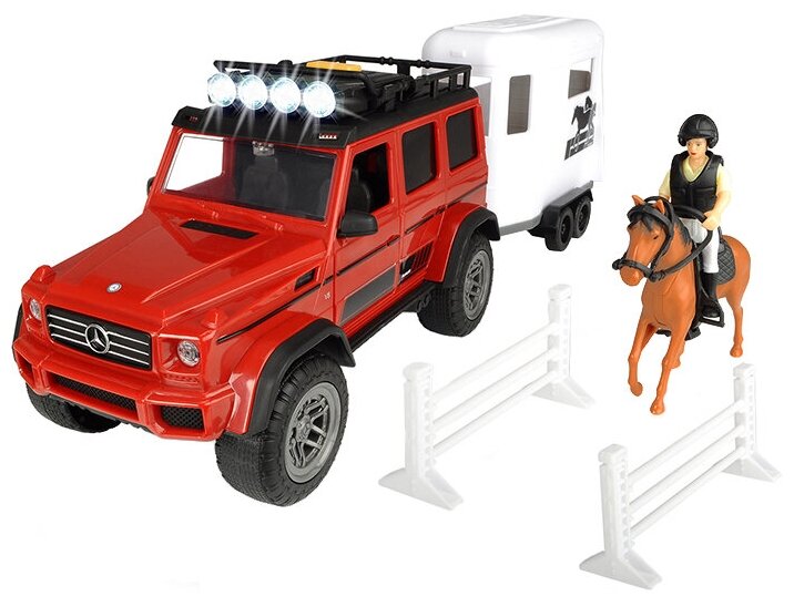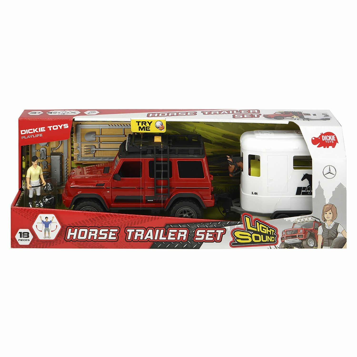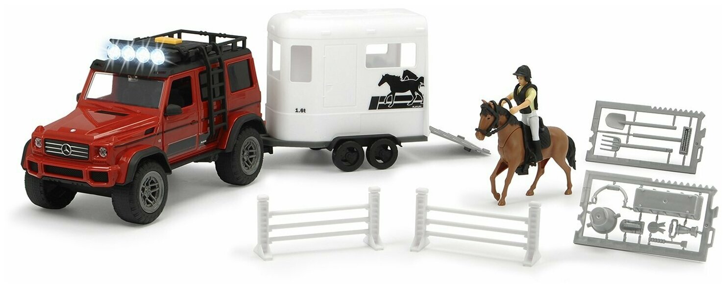 Набор для перевозки лошадей торговой марки Dickie, игровой серии PlayLife. В комплекте: внедорожник MB AMG 500 4x4 со свободным ходом, фигурка, прицеп для перевозки лошадей, лошадь, аксессуары. Световые и звуковые эффекты.