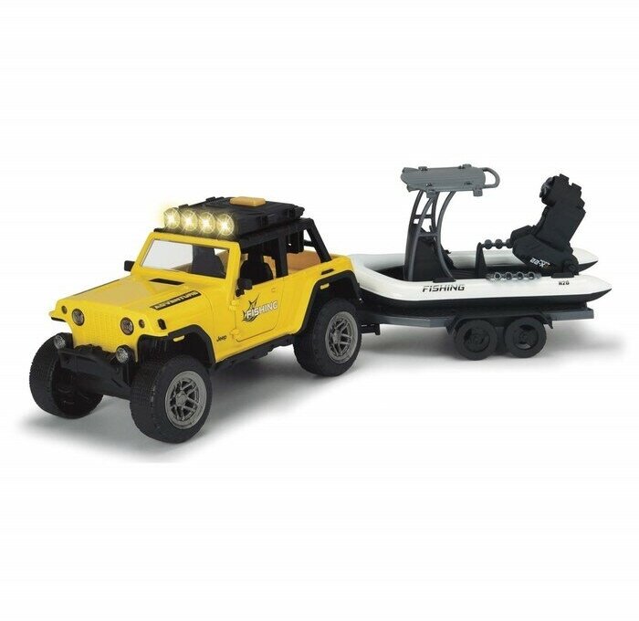 Поездка на рыбалку становится проще, если у вас есть JEEP и моторная лодка. В большом наборе Dickie вы найдете множество аксессуаров, которые помогут сделать игру интереснее. Автомобиль оснащен световыми и звуковыми эффектами, открывающимися дверцами и багажником. Прожекторы на крыше внедорожника ярко освещают путь. На прицепе расположилась моторная лодка. В комплекте с фигуркой, с подвижными руками и ногами, вы найдете фигурку собачки.