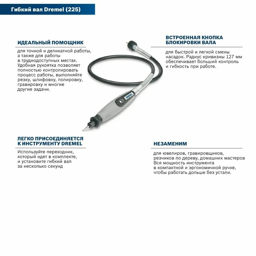 Гибкий вал-удлинитель DREMEL - идеальное приспособление для точной работы в труднодоступных местах.Радиус кривизны 127 мм обеспечивает больший контроль и гибкость при работе. Он очень легко присоединяется к инструменту Dremel. У него удобная рукоятка, что позволяет контролировать процесс резания, шлифования, полирования и выполнения других работ. Присутствует встроенная кнопка блокировки вала для быстрой и легкой смены насадки. Гибкий вал Dremel под достоинству высоко оценят те мастера, которым часто приходится проводить работы по шлифовке, резке или фрезерованию в труднодоступных местах. Благодаря небольшому весу и компактной конструкции приставку гораздо удобнее держать в руках, чем сам инструмент, поэтому она также часто используется при проведении художественных и высокоточных работ.