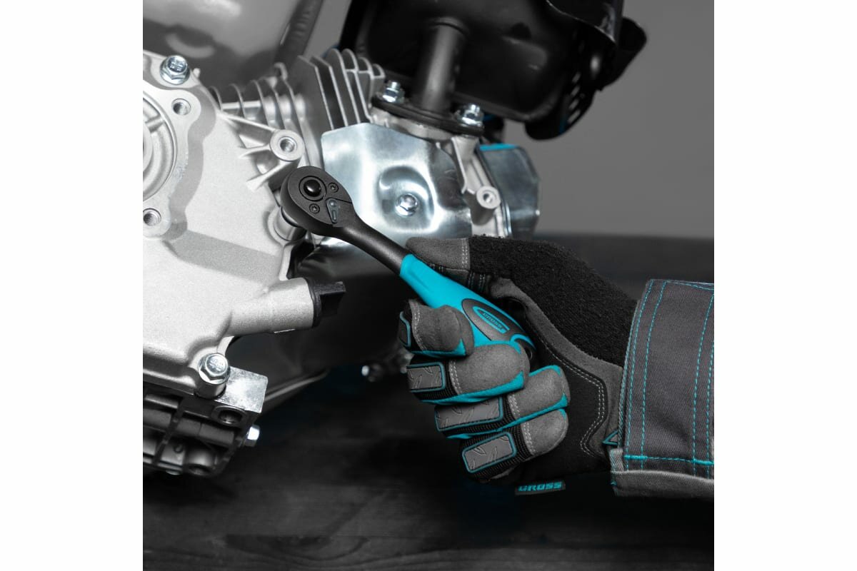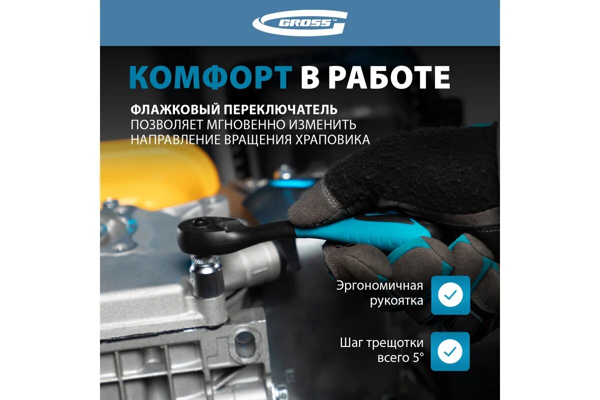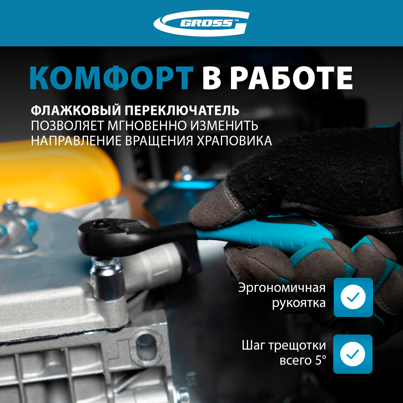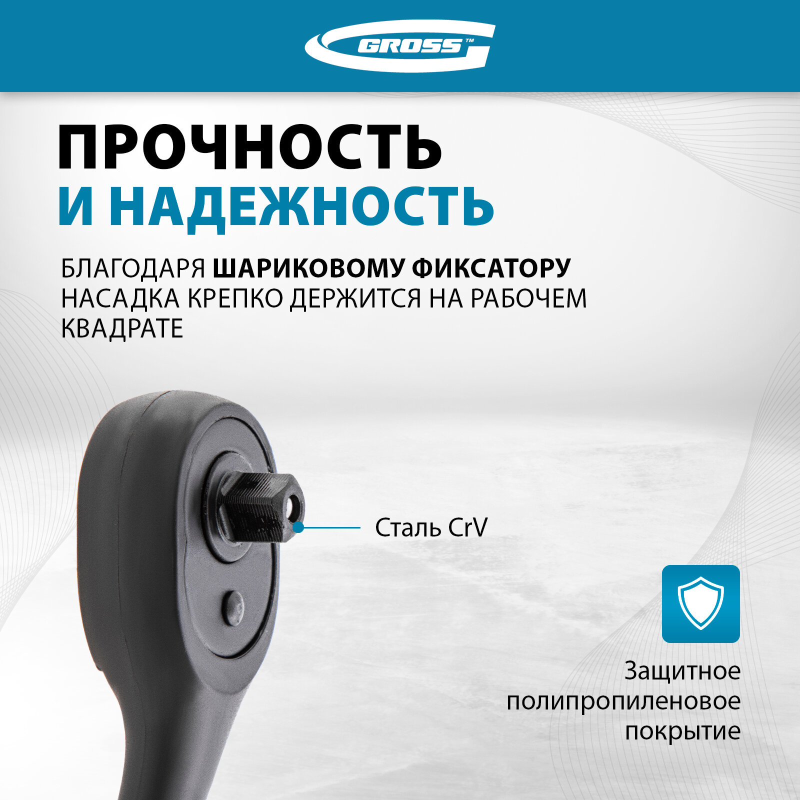 Трещотка GROSS имеет рукоятку эргономичной формы, изготовлена из хромованадиевой стали с полипропиленовым покрытием. Трещоточный механизм с реверсом и 72 зубьями обеспечивает исключительную мягкость и плавность в работе.