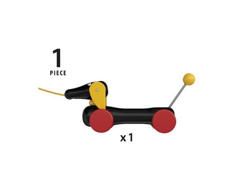 Игрушка-каталка Маленькая такса от компании Brio представляет собой деревянную собачку,которая может вертеть головкой и вилять хвостиком. Для этого ребенку нужно только потянуть за веревочку, прикрепленную к ее мордочке. Окрашенная в черный цвет, она имеет вытянутое туловище совсем как настоящая.Внимание! Цвет и дизайн упаковки варьируется.