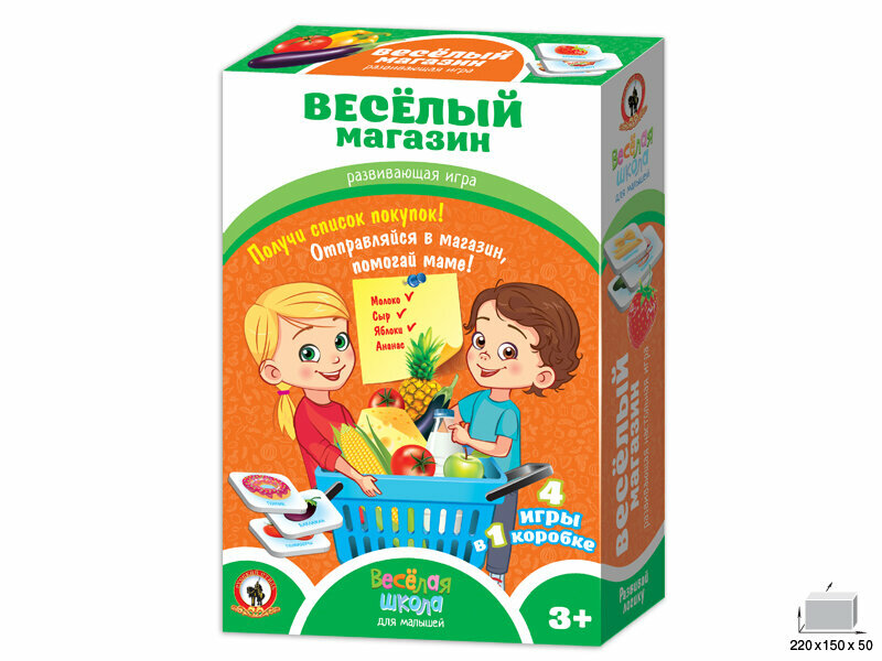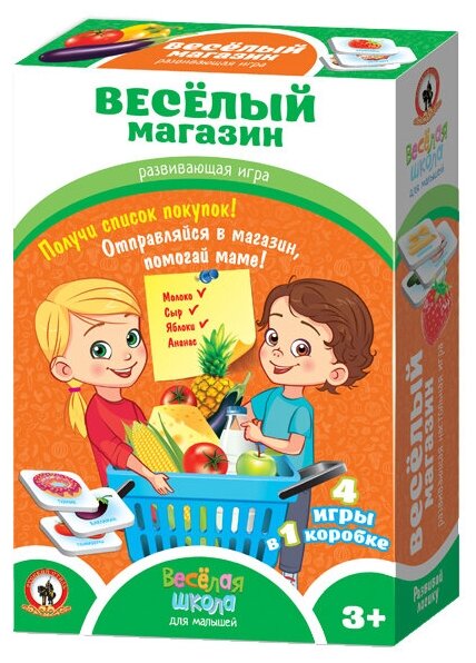 | Комплектация | список покупок - 4 шт, карточки-корзинки - 3 шт, карточки с продуктами - 24 шт, карточки-полки - 2 шт, правила игры |