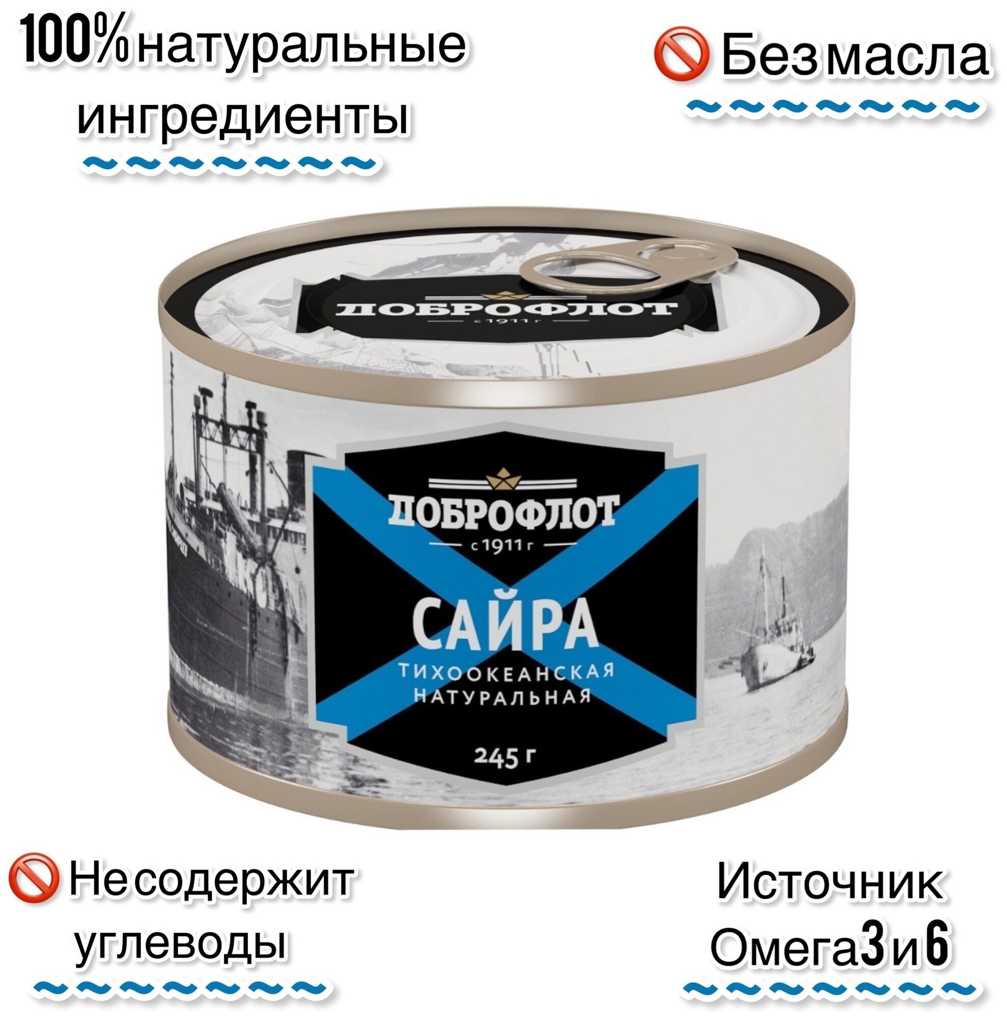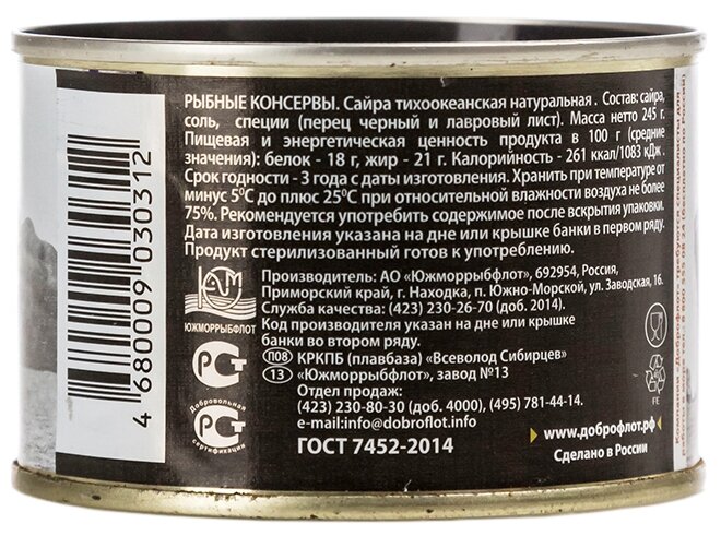 Сайра тихоокеанская 'Доброфлот'. Полезные свойства этой рыбы заключаются в ее богатом витаминно-минеральном составе (содержит жирные кислоты Омега-3 и антиоксиданты, а также железо, калий, кальций, магний, фосфор, фтор) и подтверждены множеством исследований в России и за рубежом. Консервы из тихоокеанской натуральной сайры рекомендуют регулярно потреблять диетологи для сбалансированного питания. Стоит отметить 'правильную' калорийность этих консервов, они отлично насыщают организм и утоляют чувство голода, при этом не содержат углеводов, то есть безопасны для фигуры. Консервированную сайру часто добавляют в домашние супы и салаты, запекают в ароматные пироги, подают на стол в качестве закуски, а также используют для приготовления рыбных котлет. Благодаря белкам природного происхождения сайра консервированная натуральная прекрасно усваивается и не становится причиной появления лишнего веса. Состав: рыба, соль, специи. Энергетическая ценность: 261 ккал. Пищевая ценность на 100 г продукта: белки - 18 г; жиры - 21 г. Вес: 245 г. Тип упаковки: жестяная банка. Срок годности: 36 месяцев. Условия хранения: при температуре от 5 до 25 °С и относительной влажности воздуха не более 75%. Страна производства: Россия.
