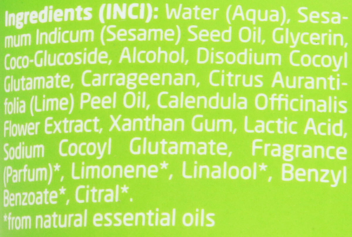 | Состав | Water (Aqua) Sesamum Indicum (Sesame) Seed Oil Glycerin Coco-Glucoside Alcohol Disodium Cocoyl Glutamate Chondrus Crispus (Carrageenan) Extract Citrus Aurantifolia (Lime) Peel Oil Calendula Officinalis Flower Extract Xanthan Gum Lactic Acid Sodium Cocoyl Glutamate Fragrance (Parfum)1 Limonene1 Linalool1 Benzyl Benzoate1 Citral1 1 from natural essential oils |