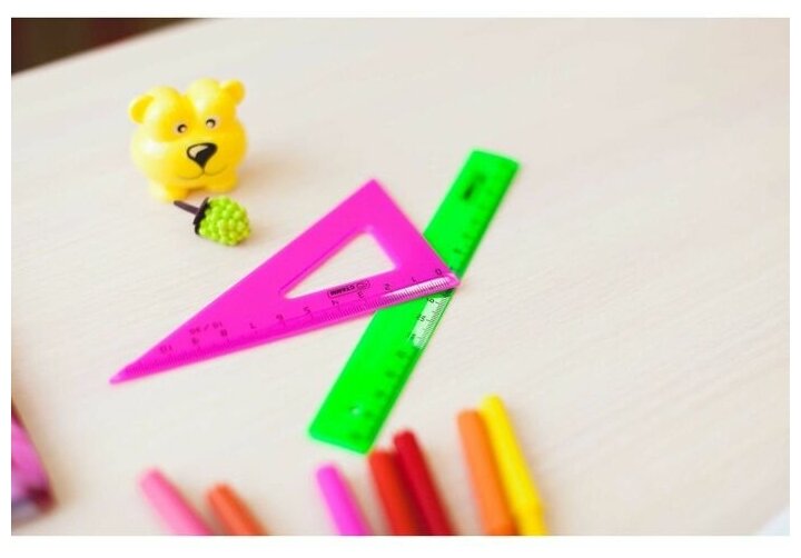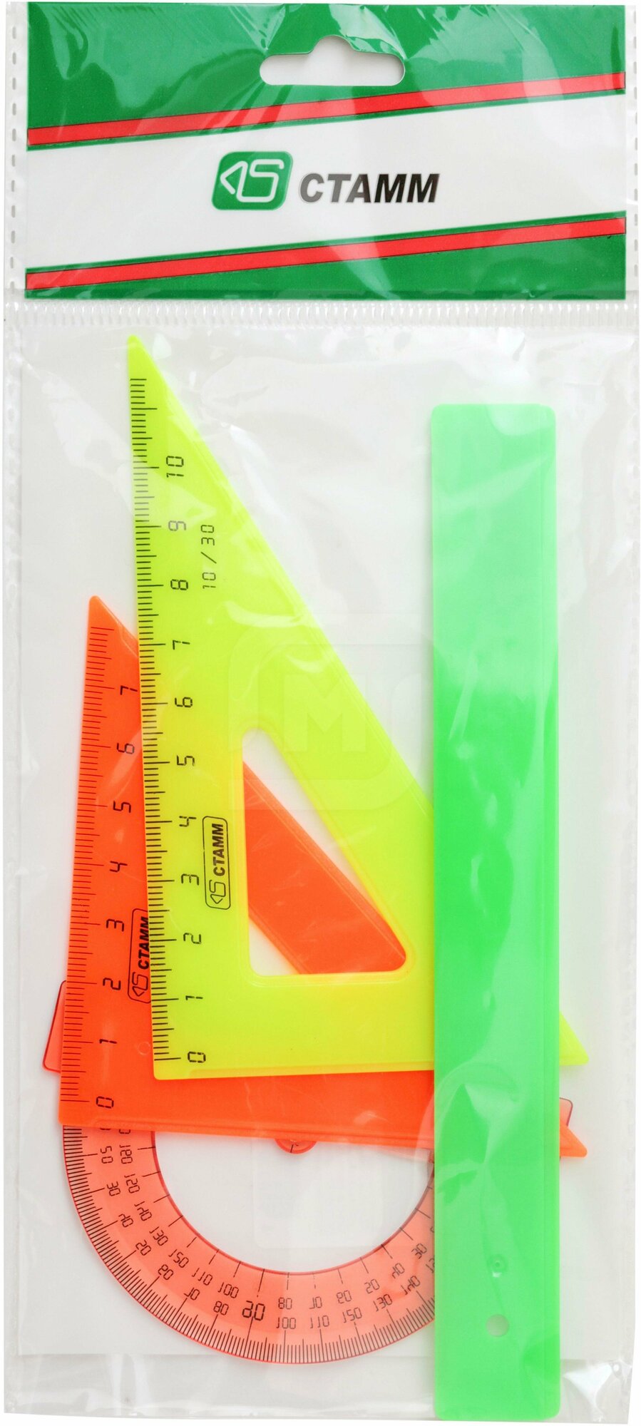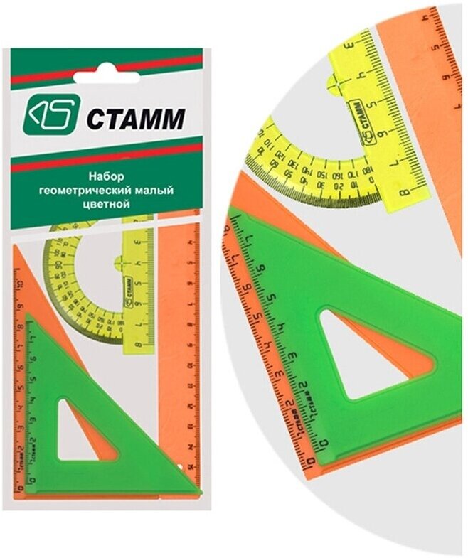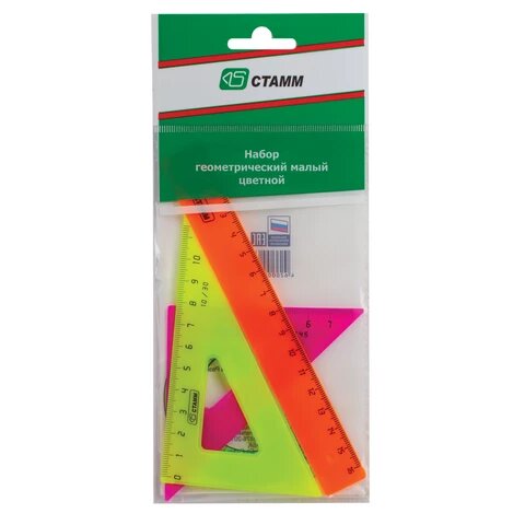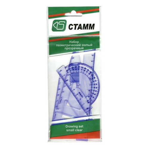 Геометрический набор Стамм выполнен из непрозрачного пластикового материала. В набор входят линейка – 16 см, треугольник – 7 см, 45°, треугольник – 10 см, 30°, транспортир – 8 см, 180°. Упаковка – яркий футляр с европодвесом.