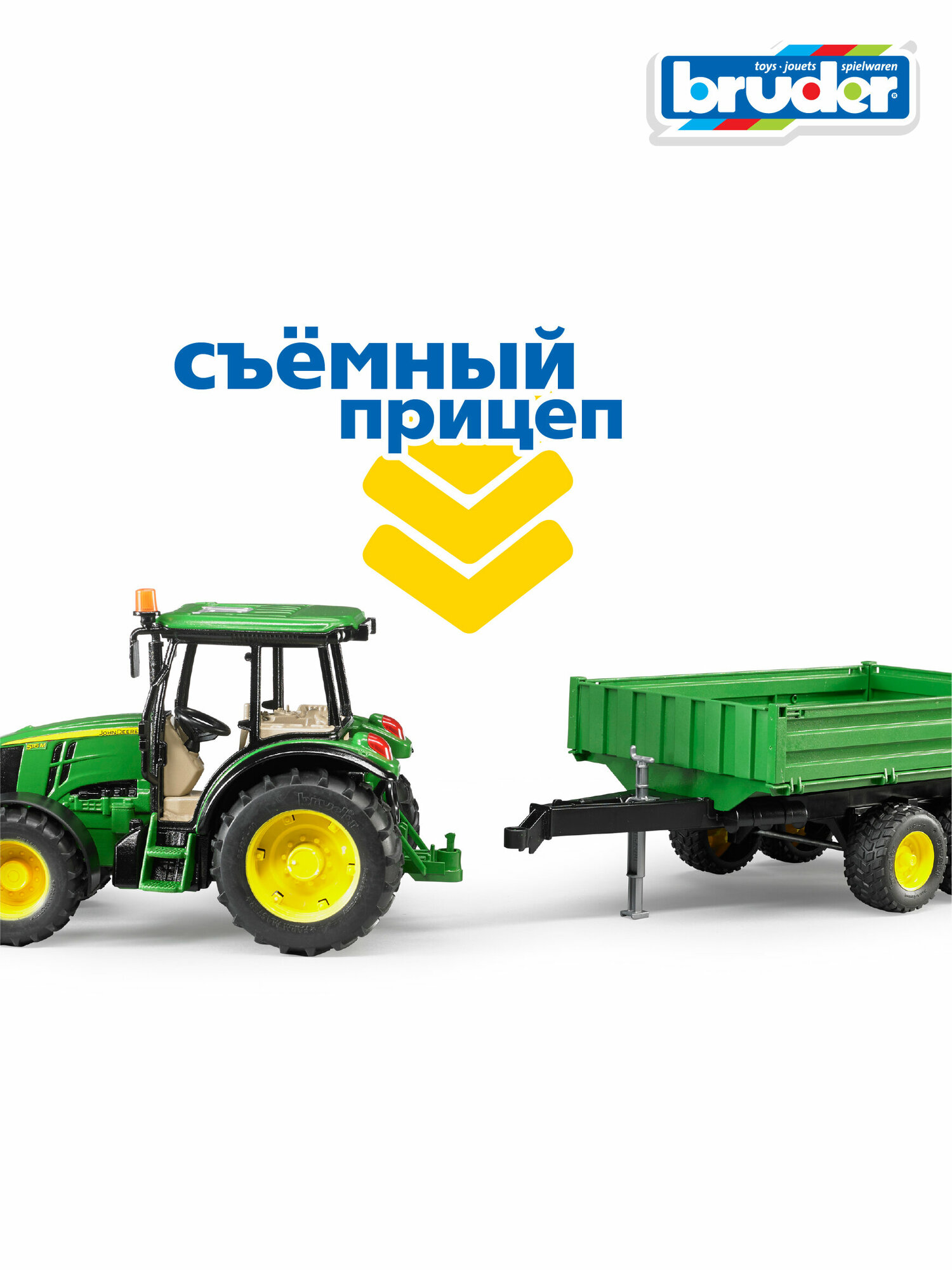 Трактор John Deere 5115M с прицепом от германского бренда Bruder приведет в восторг любого мальчика благодаря максимально реалистичному дизайну и огромным игровым возможностям. Данный трактор с отсоединяющимся прицепом, бортик которого откидывается для погрузки и разгрузки, представляет собой удивительно детализированную копию настоящей сельскохозяйственной техники John Deere 5115M. У трактора открывается капот, который можно разглядеть в мельчайших деталях. Игрушечный трактор и прицеп сделаны из материалов высокого качества, благодаря чему игрушка выглядит превосходно.