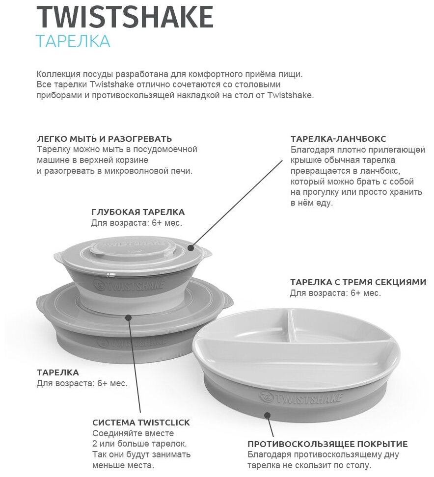 Новая серия посуды Twistshake разработана специально для комфортного кормления ребёнка. Нижняя часть тарелки изготовлена из нескользящего материала, а значит ребёнок не опрокинет случайно на стол всё её содержимое. В комплекте у всех тарелок есть «умная» крышка. Она превращает тарелку в герметичный контейнер, который удобно брать с собой на прогулку, в поездку или просто использовать для хранения. Тарелки Twistshake не займут у вас много места в шкафу или холодильнике - просто скрепите две или более тарелок вместе с помощью уникального крепления TWISTCLICK. Форма тарелок идеально сочетается со всеми столовыми приборами Twistshake.
