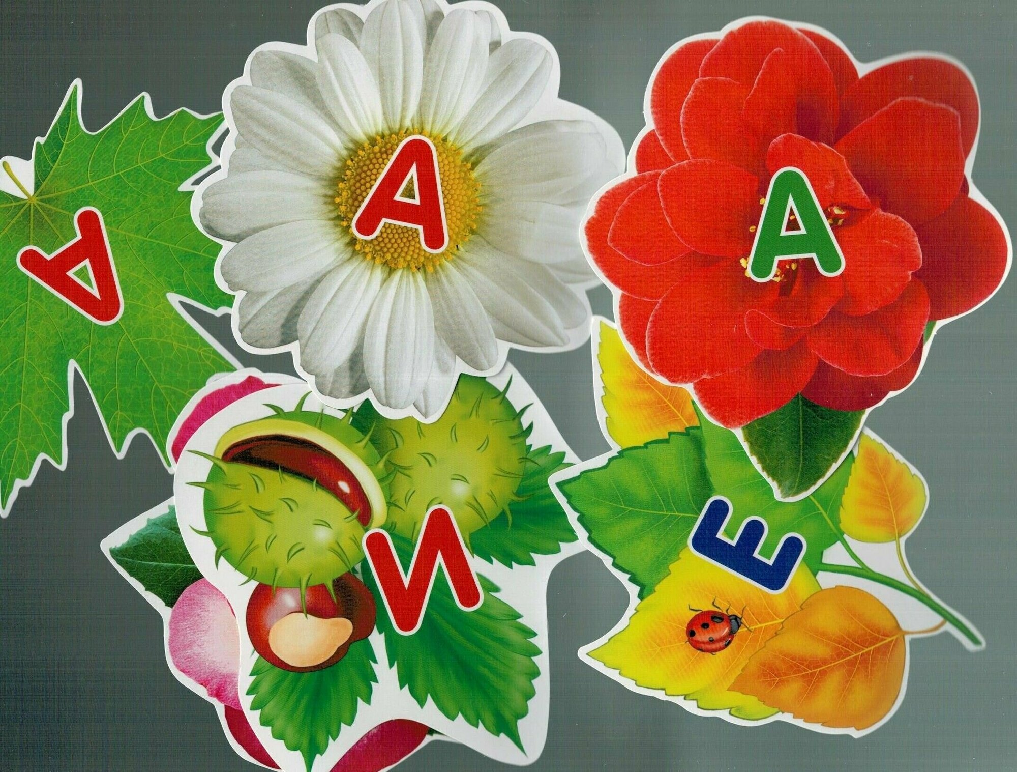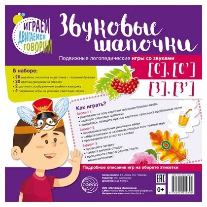 В наборе: 20 вырубных листочков и цветочков с гласными буквами, 20 цветных рисунков на обороте, 2 шапочки с изображением змейки и комарика, 4 подвижных игры на усвоение свистящих звуков.