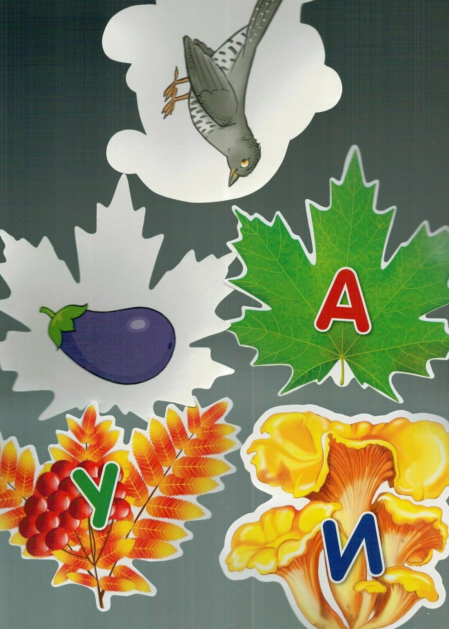 В наборе: 20 вырубных грибочков и листочков с гласными буквами, 20 цветных рисунков на обороте, 2 шапочки с изображением ежика и жука, 4 подвижных игры на усвоение свистящих звуков.