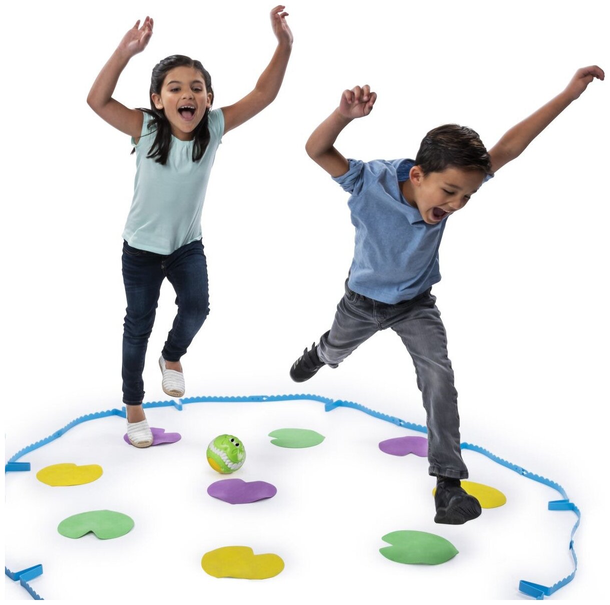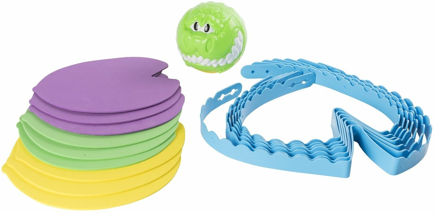Набор включает специальное игровое поле, которое образует большой круг-озеро с препятствиями по диаметру. Игрокам необходимо поместить внутрь круга разноцветные островки, выбрать себе один из них, встать на него и запустить забавный зеленый шарик в виде мордочки крокодила.