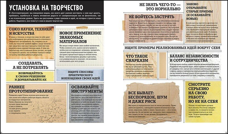 РИскусство мастерить . Авторы книги Майк Петрич и Карен Уилкинсон — создатели и руководители Творческой мастерской при музее науки и искусства «Эксплораториум». Они Занимаются популяризацией ручного творчества, как способа познания мира. Если на детском уровне Пластилиновая лаборатория с Чевостиком поможет разобраться в строении лампочки путём лепки её из пластилина, то здесь более высокий уровень, хотя все опыты можно легко повторить дома, так как используются самые обычные материалы- и картон, тесто, пластиковые пакеты и все такое. Мы пока сами ничего не делали, и думаю, если и начнём, то нескоро. Но само описание этих проектов, само знакомство с этими креативными идеями настолько вкусно и заставляет задуматься, что нам пока и этого достаточно. Начинать считать можно с любого мастера и с любой страницы. На марионетках мы уже заложили книжную закладочку))