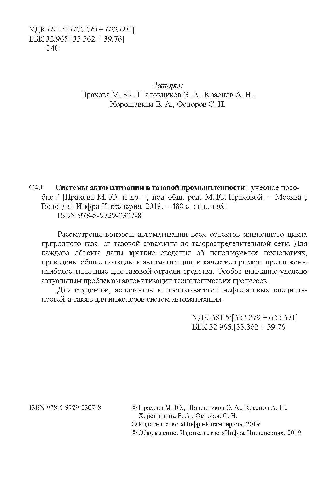Системы автоматизации в газовой промышленности (Прахова Марина Юрьевна, Шаловников Эрнст Александрович, Краснов Андрей Николаевич); Инфра-Инженерия, 2019