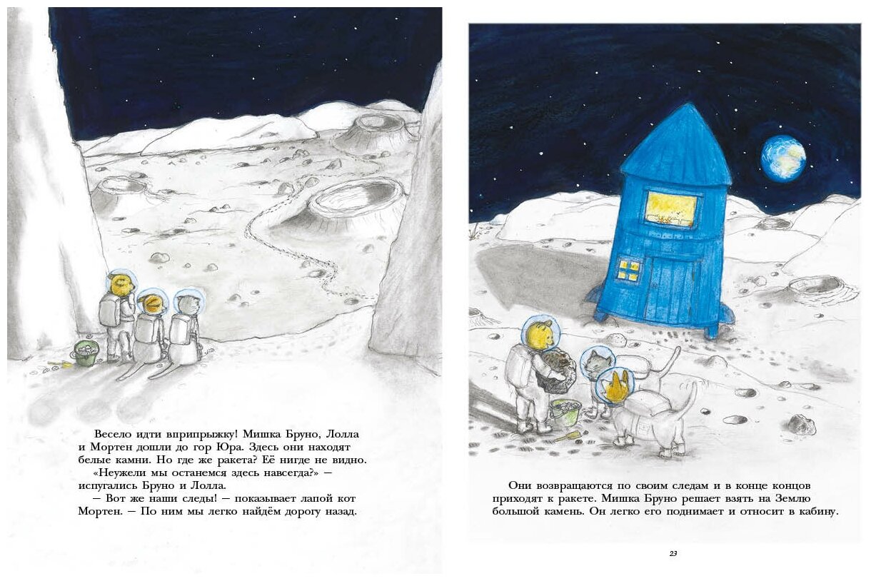 Мишка Бруно и его собака Лолла - знаменитые герои серии познавательных книжек-картинок, посвящённых наблюдению за природой: "Осень мишки Бруно", "Зима мишки Бруно", "Весна мишки Бруно", "Лето мишки Бруно". На этот раз Бруно, Лолла и кот Мортимер решают отправиться на Луну. За время путешествия друзья узнают много удивительных фактов о спутнике Земли и даже привозят домой лунные камни. В конце книги читателя ждет особая познавательная часть - "Записки мишки Бруно". Там есть карта Луны, сведения о ее размерах и географии, а также доступное объяснение того, что такое сила земного притяжения и почему Луна видна нам то целиком, то лишь наполовину, а то и вовсе не видна. Все книги о мишке Бруно можно назвать мини-энциклопедиями для самых маленьких читателей от 3 до 5 лет. Они дают первые необходимые сведения об окружающем мире и отличаются нежными иллюстрациями пастельных тонов, множеством деталей для рассматривания на каждой странице и обаятельными главными героями. Мишку Бруно и его друзей придумала и нарисовала шведская художница Гунилла Ингвес (род. 1939). В серии книг Гуниллы Ингвес о мишке Бруно в нашем издательстве также выходят книги: "Осень мишки Бруно" "Зима мишки Бруно" "Весна мишки Бруно" "Лето мишки Бруно"