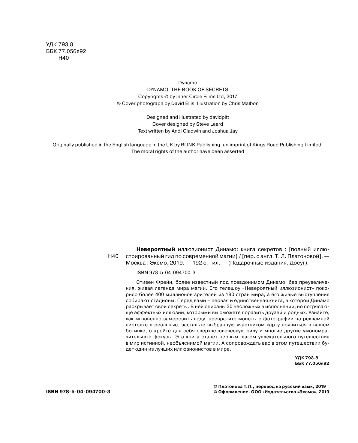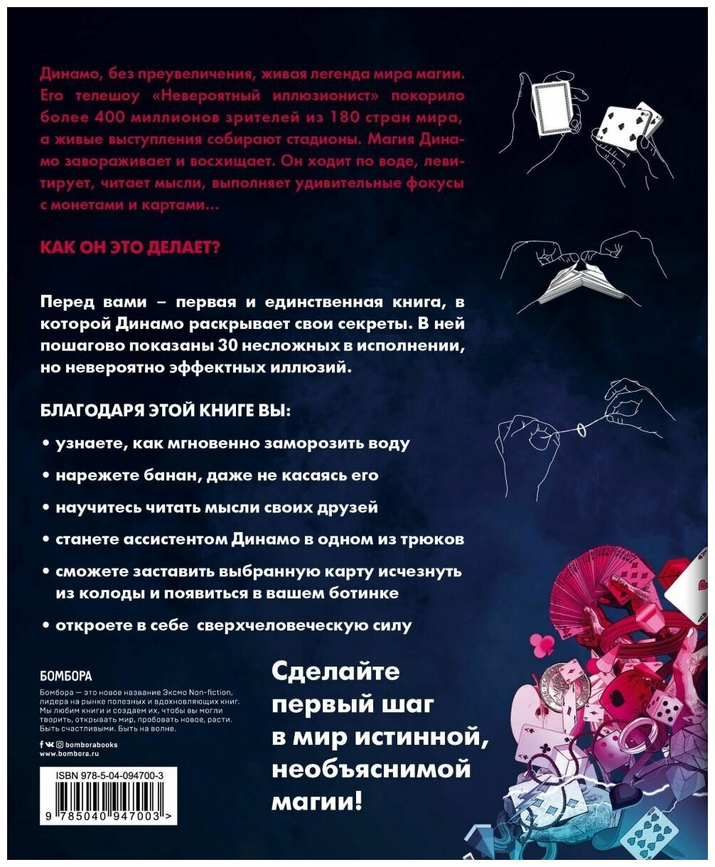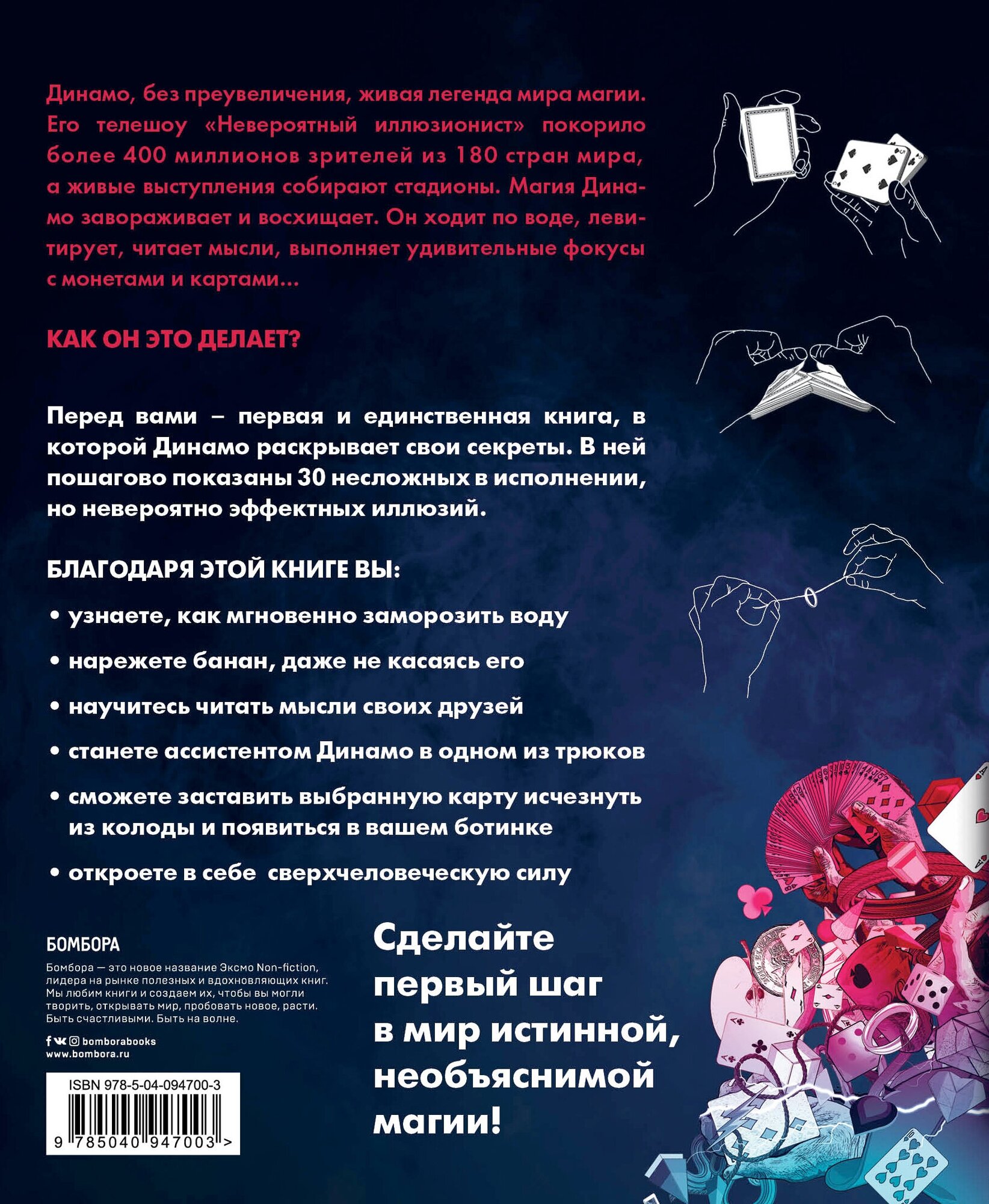Стивен Фрейн, более известный под псевдонимом Динамо, без преувеличения, живая легенда мира магии. Его телешоу "Невероятный иллюзионист" покорило более 400 миллионов зрителей из 180 стран мира, а его живые выступления собирают стадионы. Перед вами - первая и единственная книга, в которой Динамо раскрывает свои секреты. В ней описаны 30 несложных в исполнении, но потрясающе эффектных иллюзий, которыми вы сможете поразить друзей и родных. Узнайте, как мгновенно заморозить воду, превратите монеты с фотографии на рекламной листовке в реальные, заставьте выбранную участником карту появиться в вашем ботинке, откройте для себя сверхчеловеческую силу и многие другие умопомрачительные фокусы. Эта книга станет первым шагом увлекательного путешествия в мир истинной, необъяснимой магии. А сопровождать вас в этом путешествии будет один из лучших иллюзионистов в мире.