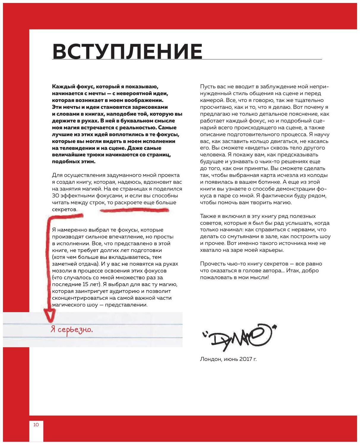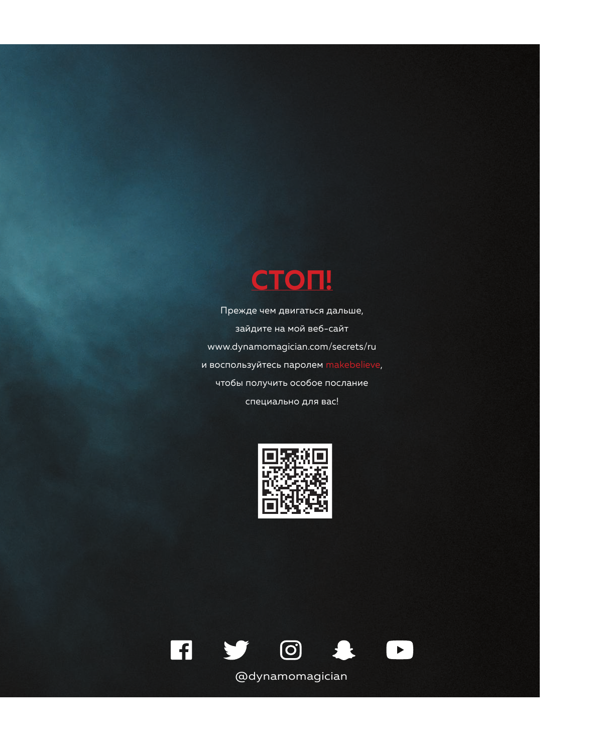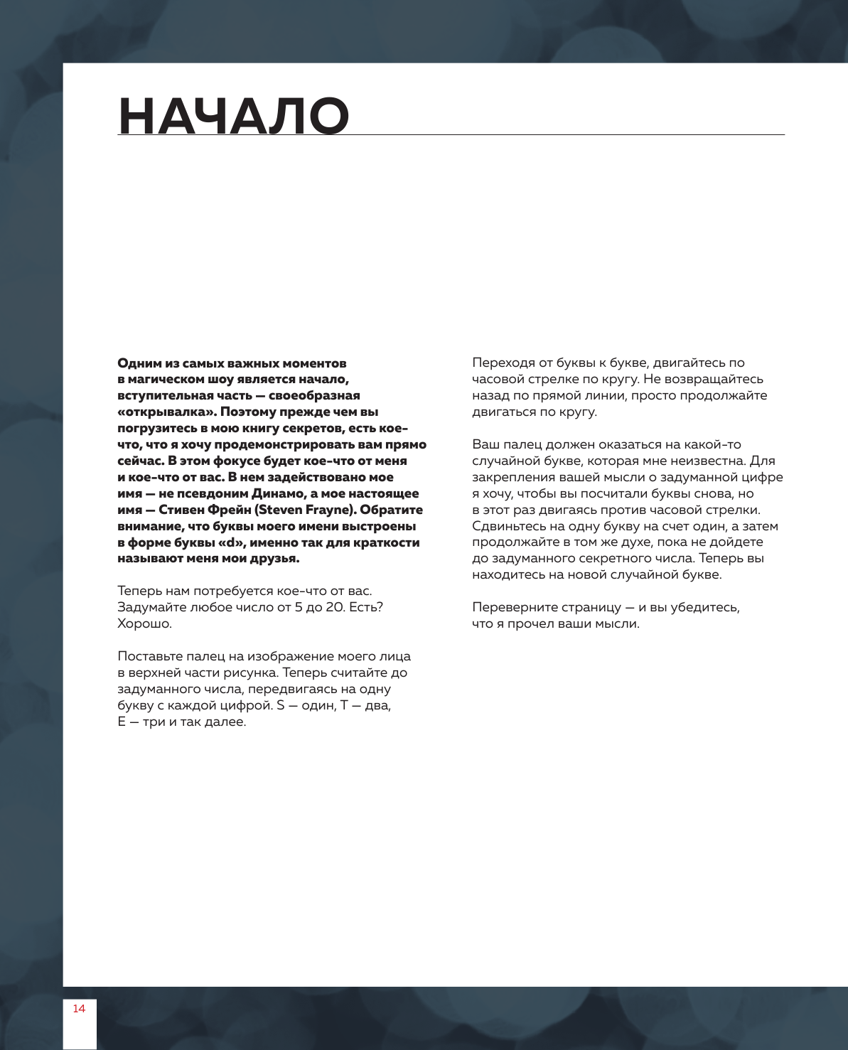 Стивен Фрейн, более известный под псевдонимом Динамо, без преувеличения, живая легенда мира магии. Его телешоу "Невероятный иллюзионист" покорило более 400 миллионов зрителей из 180 стран мира, а его живые выступления собирают стадионы. Перед вами - первая и единственная книга, в которой Динамо раскрывает свои секреты. В ней описаны 30 несложных в исполнении, но потрясающе эффектных иллюзий, которыми вы сможете поразить друзей и родных. Узнайте, как мгновенно заморозить воду, превратите монеты с фотографии на рекламной листовке в реальные, заставьте выбранную участником карту появиться в вашем ботинке, откройте для себя сверхчеловеческую силу и многие другие умопомрачительные фокусы. Эта книга станет первым шагом увлекательного путешествия в мир истинной, необъяснимой магии. А сопровождать вас в этом путешествии будет один из лучших иллюзионистов в мире.