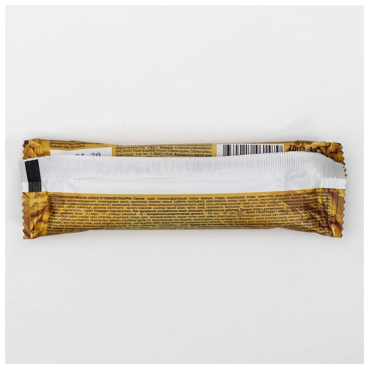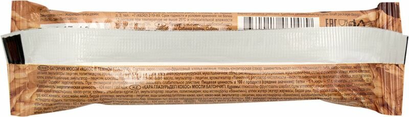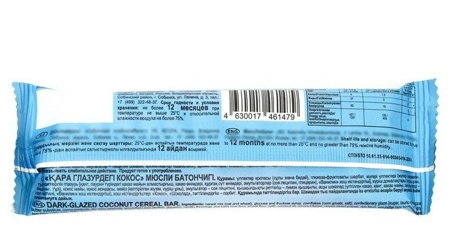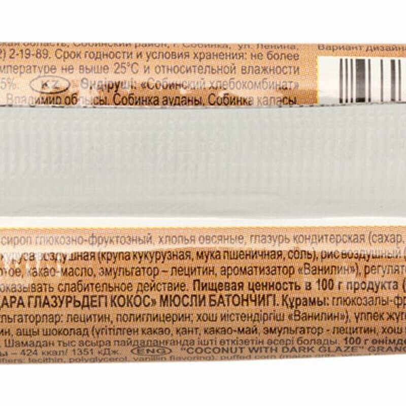 | Состав | сироп глюкозно-фруктозный, хлопья овсяные, глазурь кондитерская [сахар, заменитель какао-масла нетемперируемый лауринового типа (фракция гидрогенизированного пальмоядрового масла, эмульгаторы (лецитин соевый , сорбитан тристеарат)), какао-порошок, молоко сухое цельное, эмульгаторы (лецитин соевый, эфиры полиглицерина ивзаимоэтерифицированных рициноловых кислот), ароматизатор «Ванилин»], хлопья кукурузные (кукурузная крупа, сахар, соль), рис воздушный (рис, сахар, соль), масло кокосовое, стружка кокосовая, эмульгатор – лецитин соевый, изюм, хлопья пшеничные, регулятор кислотности - кислота лимонная, шоколад горький (какао тертое, сахар, какао-масло, эмульгатор – лецитин соевый, ароматизатор «Ванилин»), ароматизаторы |