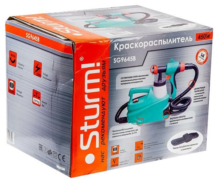 Электро краскопульт SG 9645 B STURM Краскораспылитель электро STURM 9645 B – удобный электроинструмент для бытового использования во время ремонта, отделки жилых помещений и офисов. Предназначен для распыления красящего вещества на стены, потолки, другие поверхности. STURM 9645 B комплектуется коллекторным двигателем с турбиной (технология HVLP). Мощность мотора – 450 Вт. Бак объемом 0,7 л расположен в нижней части устройства.