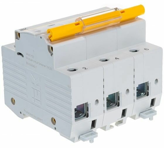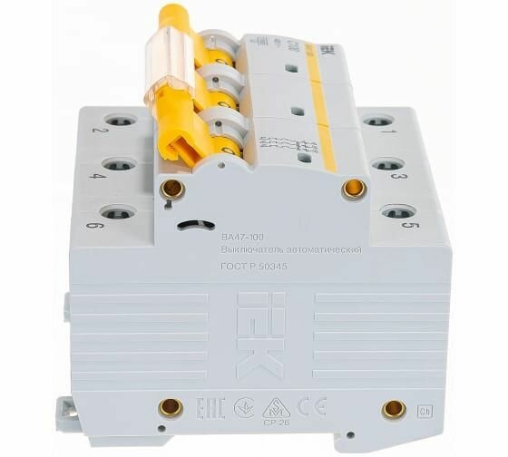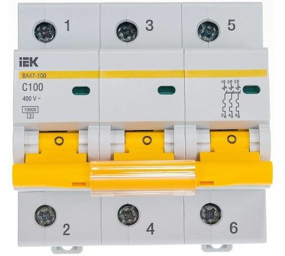 IEK ВА47-100 Автомат 3Р 100А (С) 10kA Автоматический выключатель 3P 100 A C 10kA IEK ВА47-100 предназначен для защиты распределительных и групповых цепей, имеющих активную и индуктивную нагрузки. Рекомендуются к применению во вводно-распределительных устройствах бытовых и промышленных электроустановок. Насечки на контактных зажимах снижают тепловые потери и увеличивают механическую устойчивость соединения. Эргономичный дизайн рукоятки включения/выключения облегчает процесс коммутации.