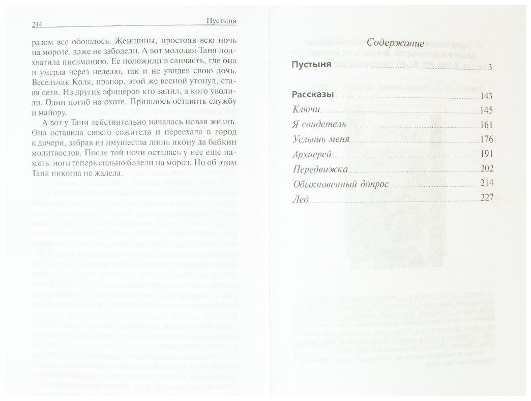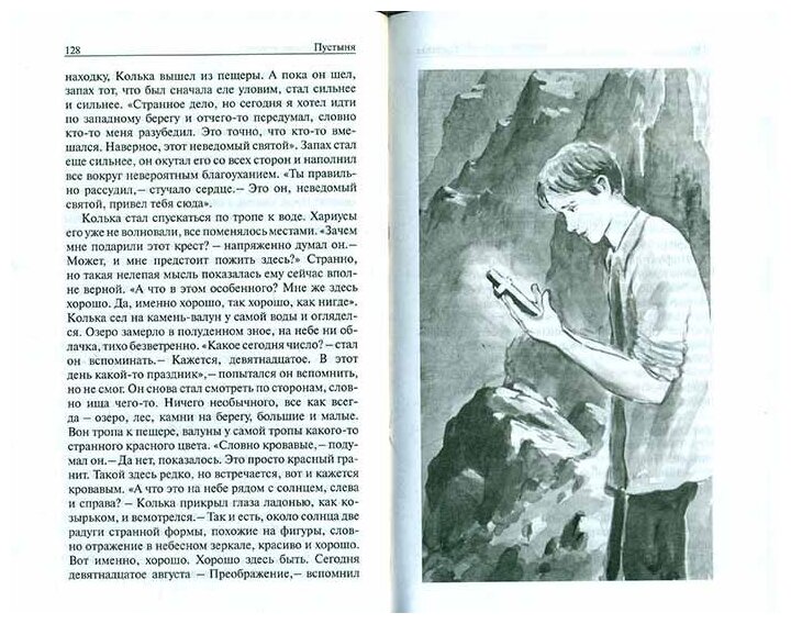 Герой повести "Пустыня", студент-художник, неожиданно для себя во время летней практики на пустынном острове ощутил прикосновение Божией благодати, и это изменило весь его жизненный уклад.
