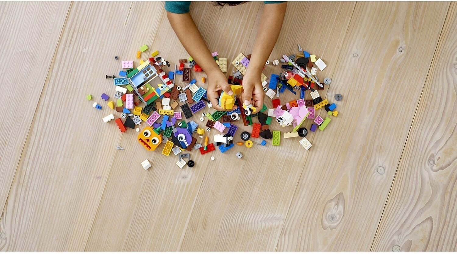 Набор конструктора LEGO Classic Кубики и глазки состоит из 450 деталей. С ним малыш от 4 лет сможет собственными руками собрать множество невероятных моделек: от тыковки до зоомагазина. В наборе серии LEGO Classic нет заранее обозначенной тематики, поэтому можно включить фантазию и свободно творить. Используя стандартные блоки и специальные элементы (множество вариаций глазок), из деталей можно собрать невероятные модели! В набор также входит книжечка с идеями.