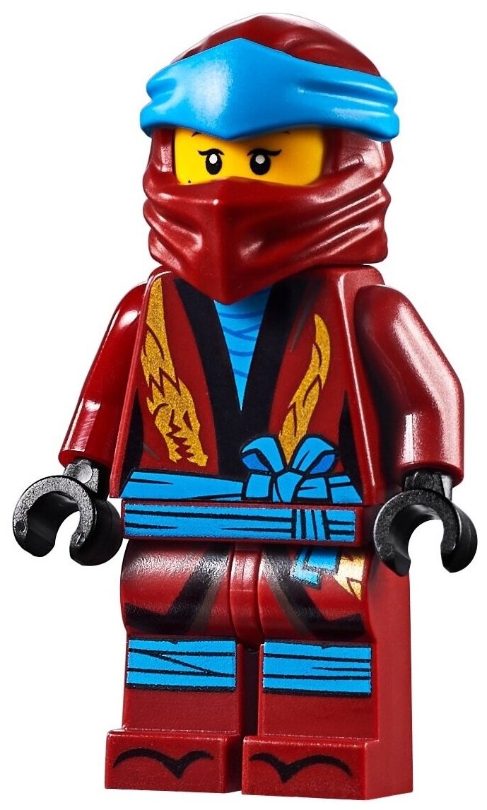 Минифигурка Кая представлена в красном цвете с выбитым на костюме золотистым драконом, такой же шлем. Ниндзя держит в руках две золотые катаны.