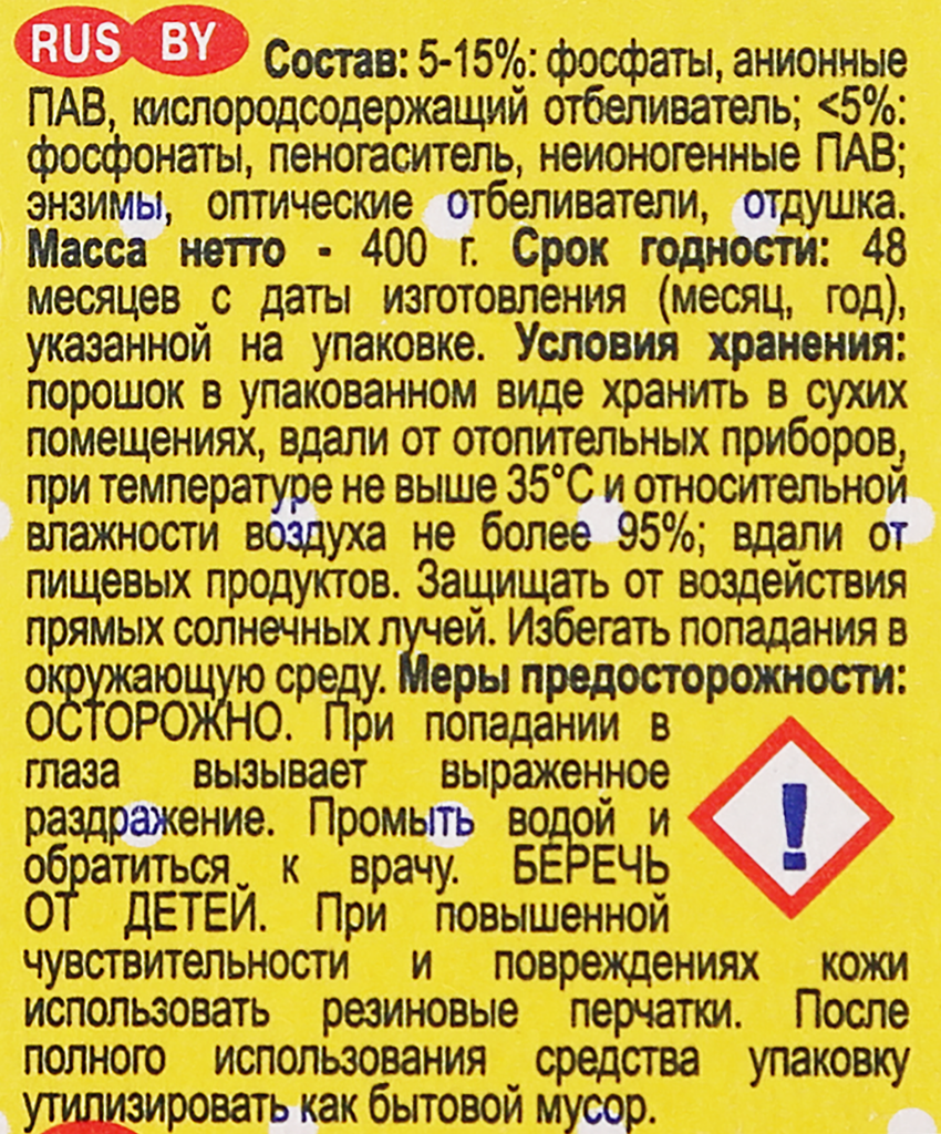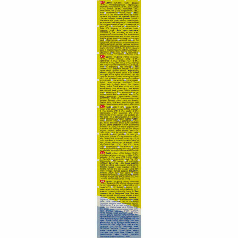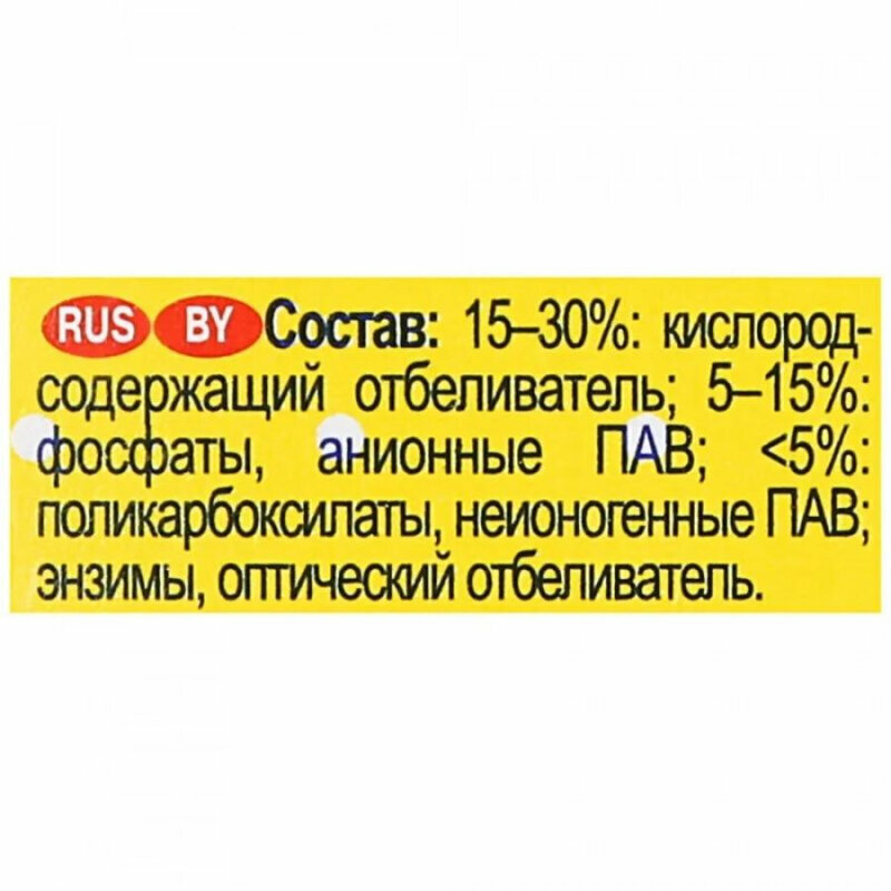 | Химический состав | сульфаты (>30%), фосфаты (15-30%), кислородосодержащие отбеливающие вещества (5-15%), анионные ПАВ (5 - 15%), карбонаты (5-15%), силикаты (5- 5%), неионогенные ПАВ (<5%), антиресорбенты(<5%), энзимы, оптические отбеливатели, отдушка |