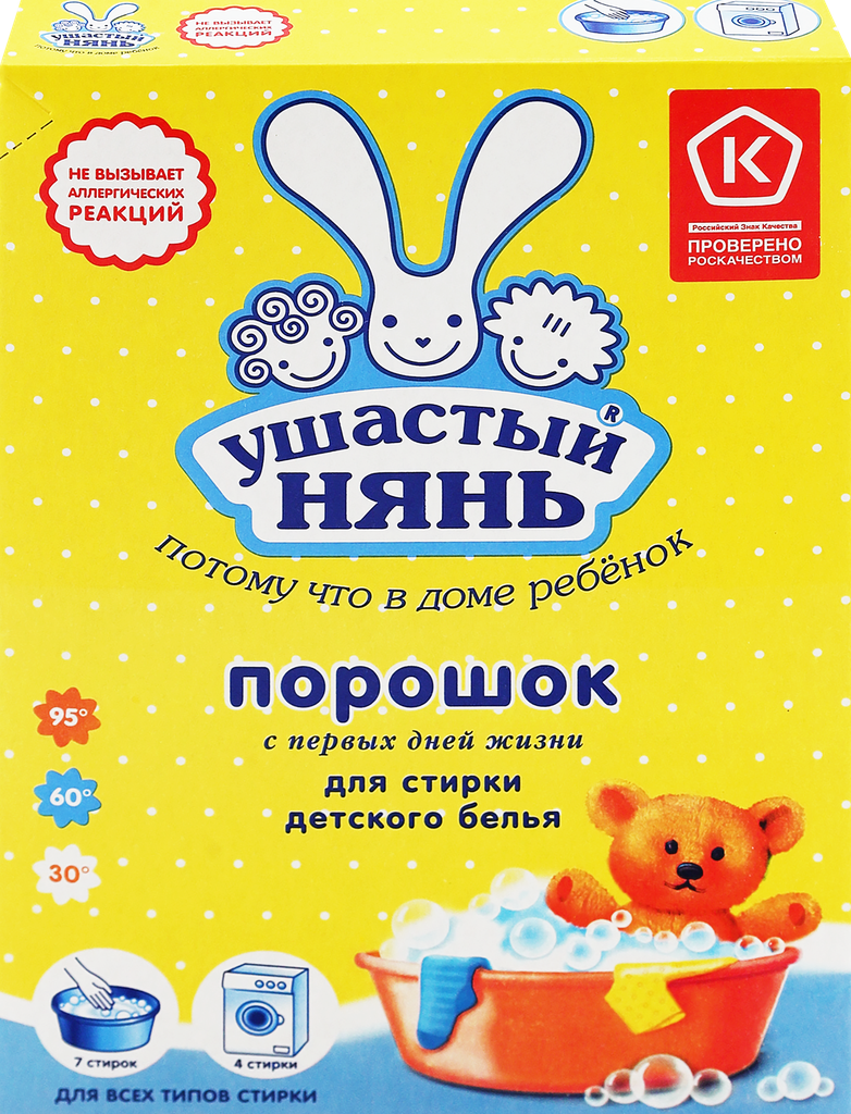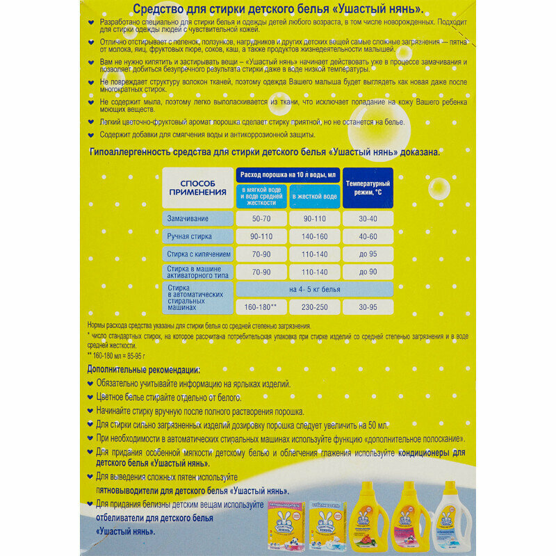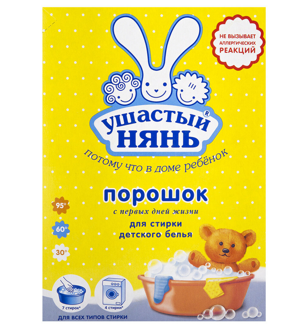 Стиральный порошок Ушастый нянь Для стирки детского белья. С первых дней жизни. Не вызывает аллергических реакций. Предназначено для стирки детских изделий, в том числе новорожденных, из хлопчатобумажных, льняных, синтетических тканей, а также тканей из смешанных волокон (кроме изделий из натурального шелка и шерсти), в автоматических стиральных машинах, машинах активаторного типа и ручной стирки.