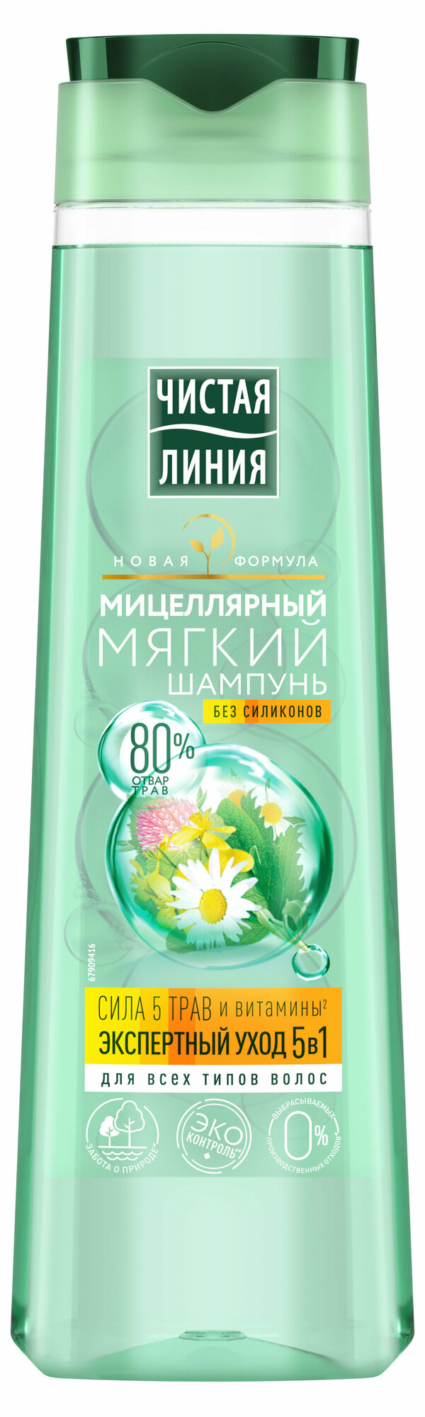 Откройте для себя шампунь Чистая линия Мицеллярный мягкий Экспертный уход 5 в 1. Он подходит для всех типов волос, бережно и при этом эффективно очищает, а растительные компоненты в его составе ухаживают за вашими волосами. Мицеллярная основа бережно очищает и увлажняет волосы, а 80% отвара трав наполняет волосы силой. Фитовитамины придают блеск и мягкость.
