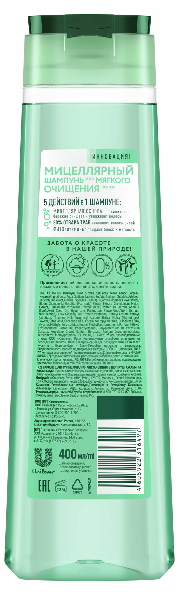Мицеллярный шампунь Чистая Линия Экспертный уход 5в1 для всех типов волос без силиконов